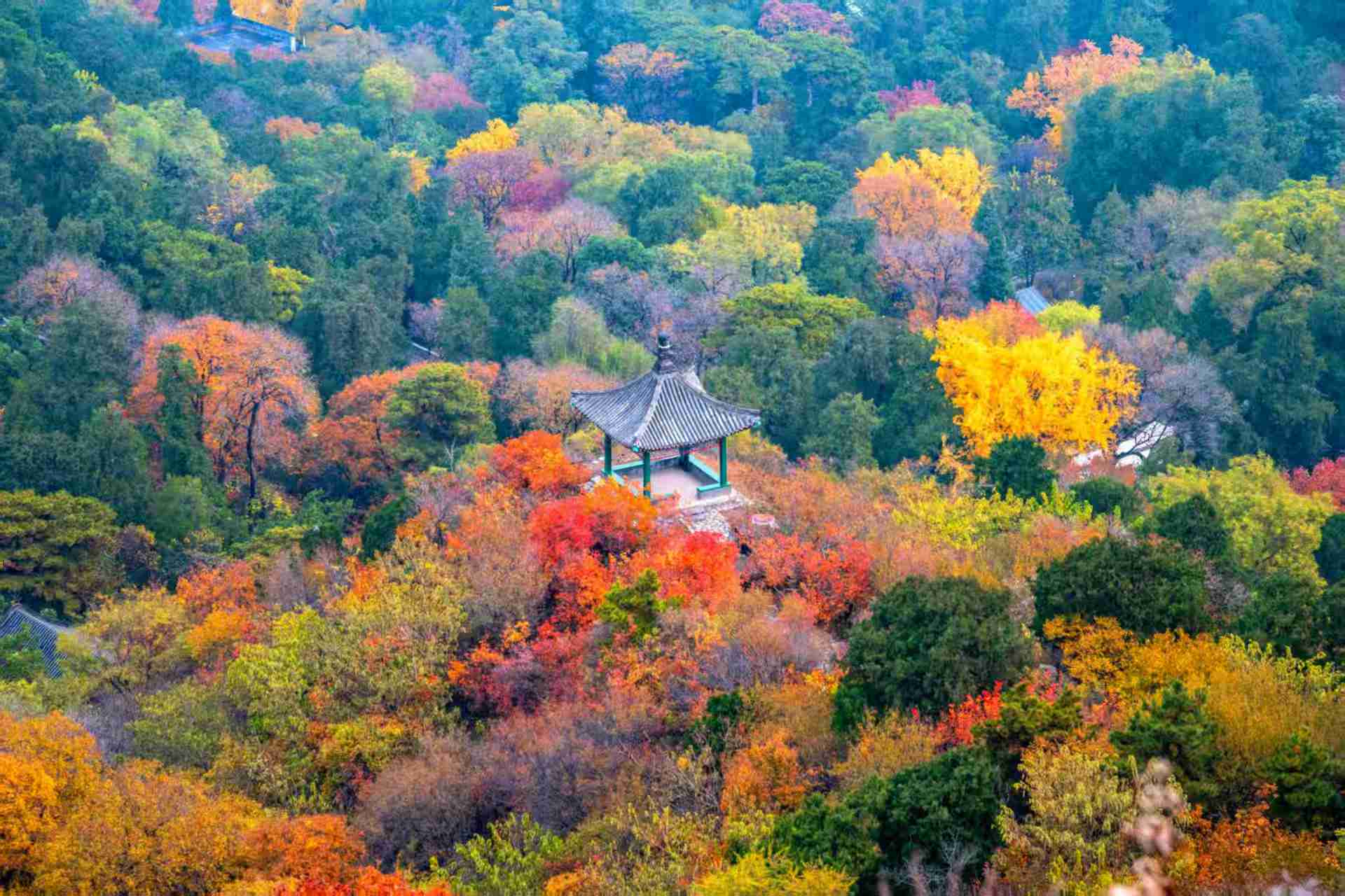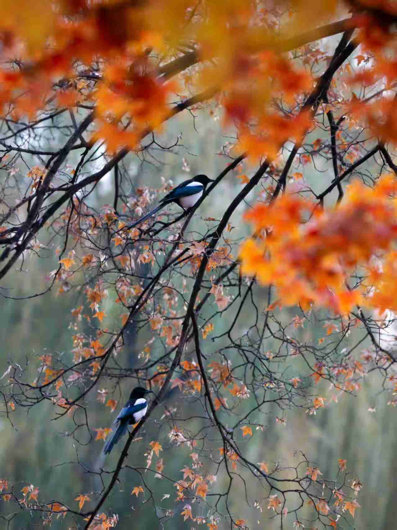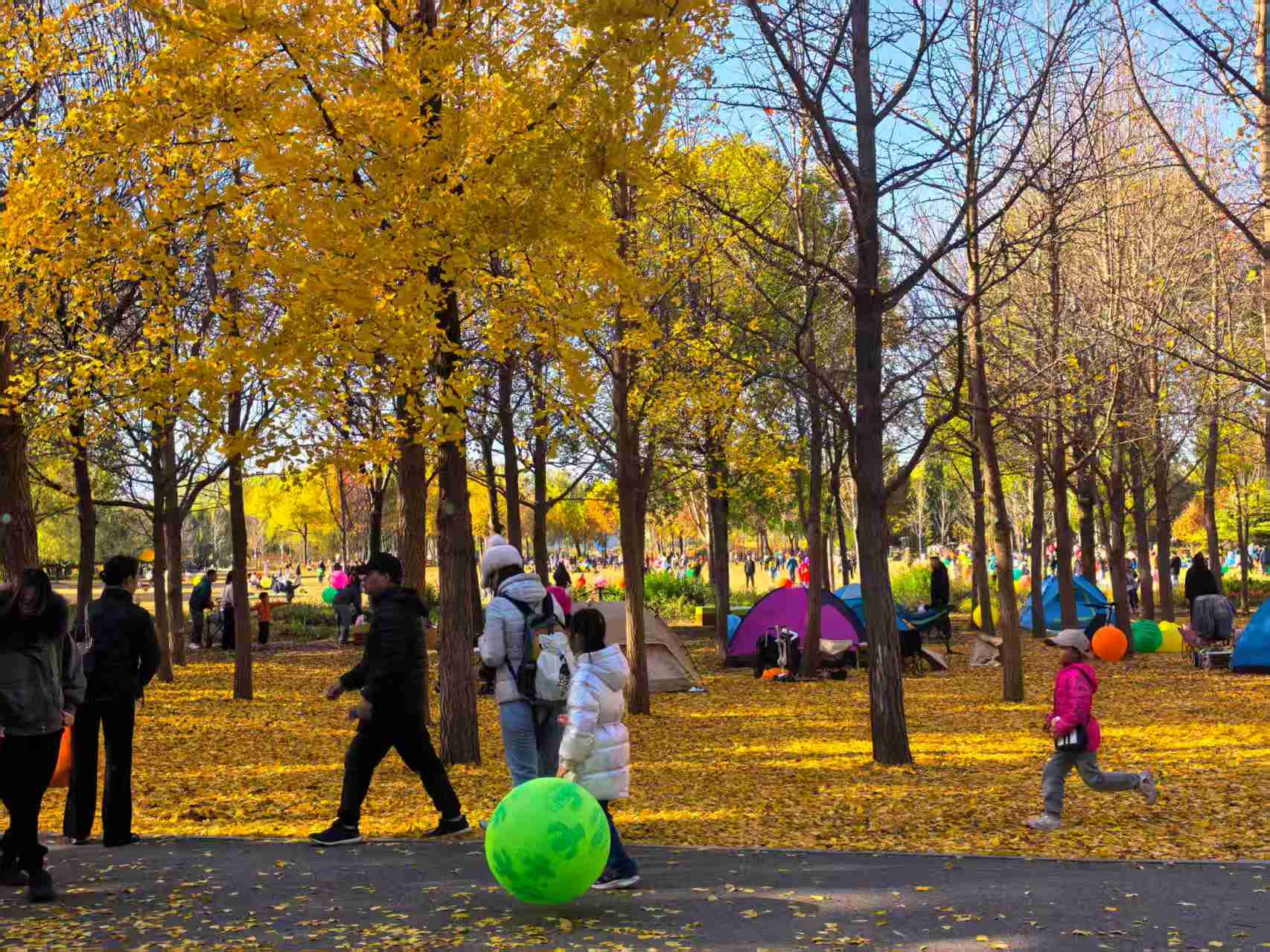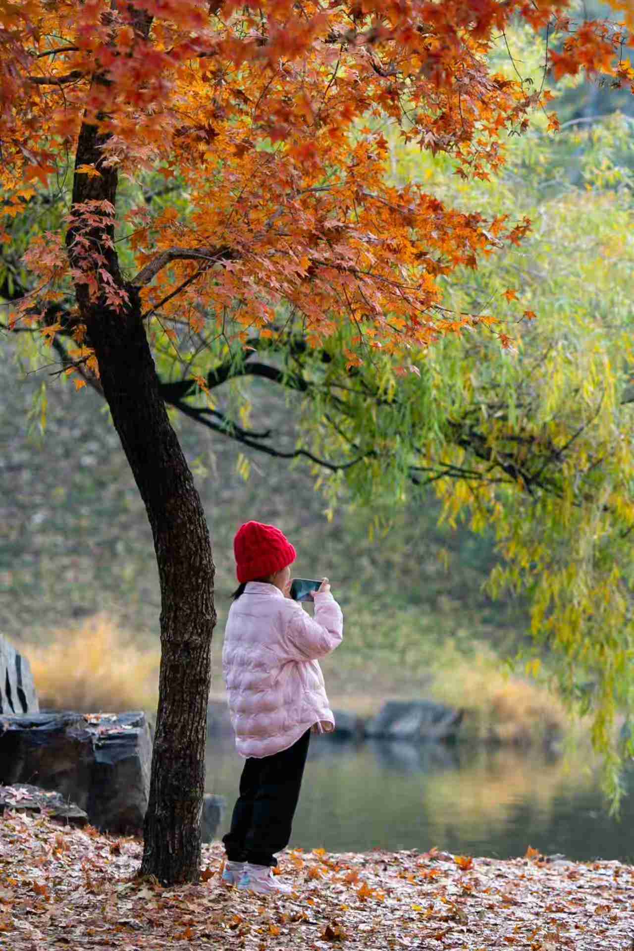 今天北京海淀公园彩叶缤纷,游人畅享假日的美好生活。