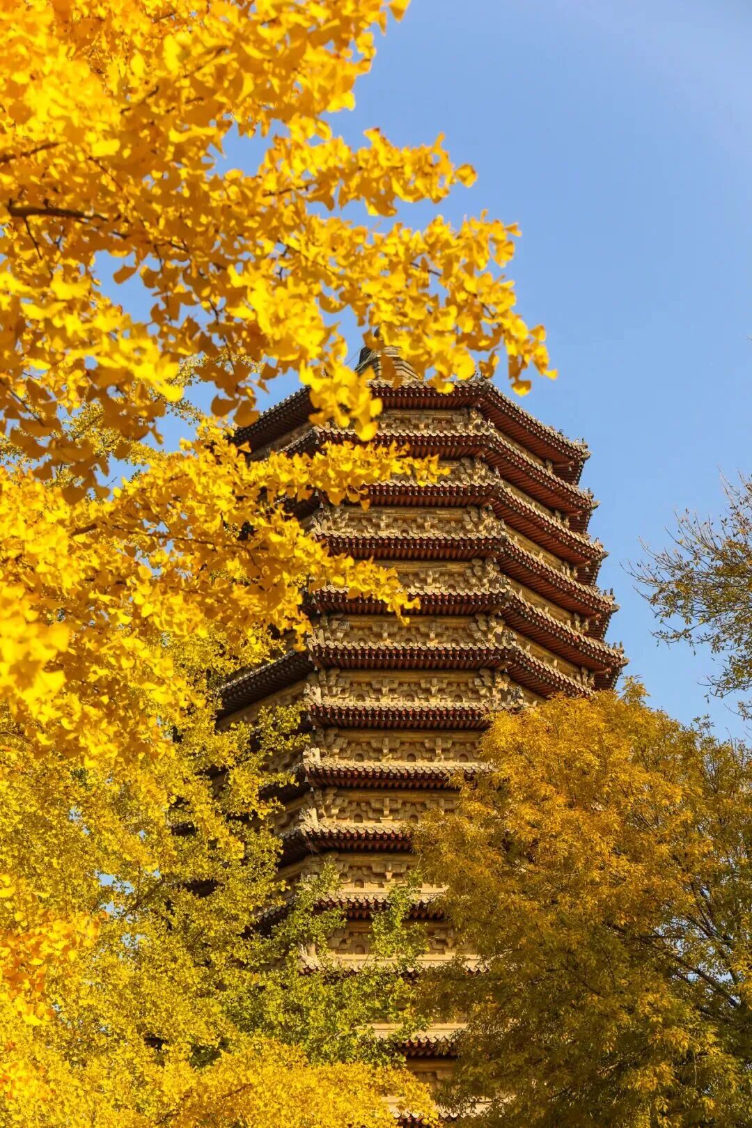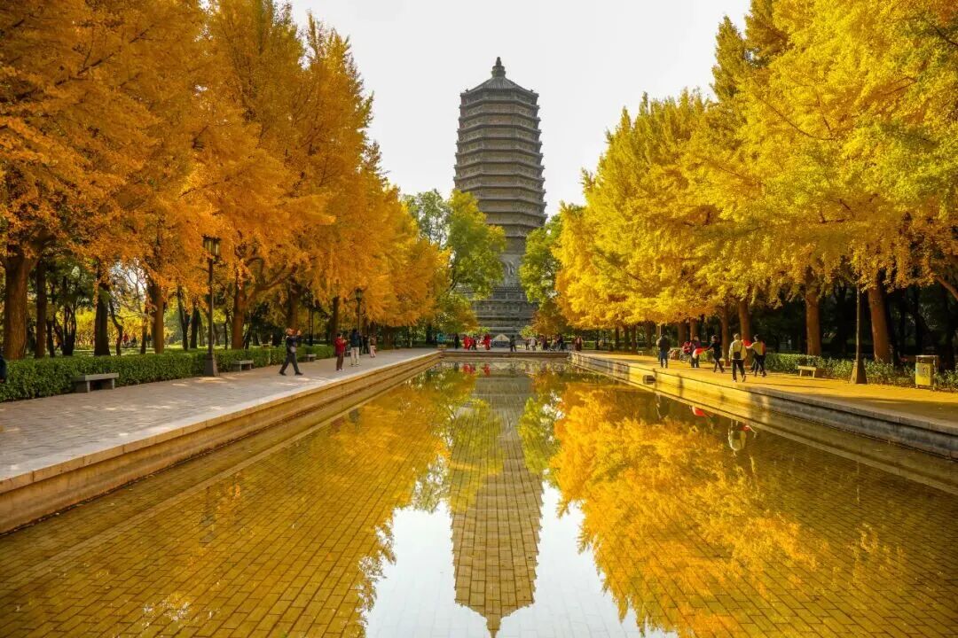 金黄的银杏与池水和古塔相映成趣