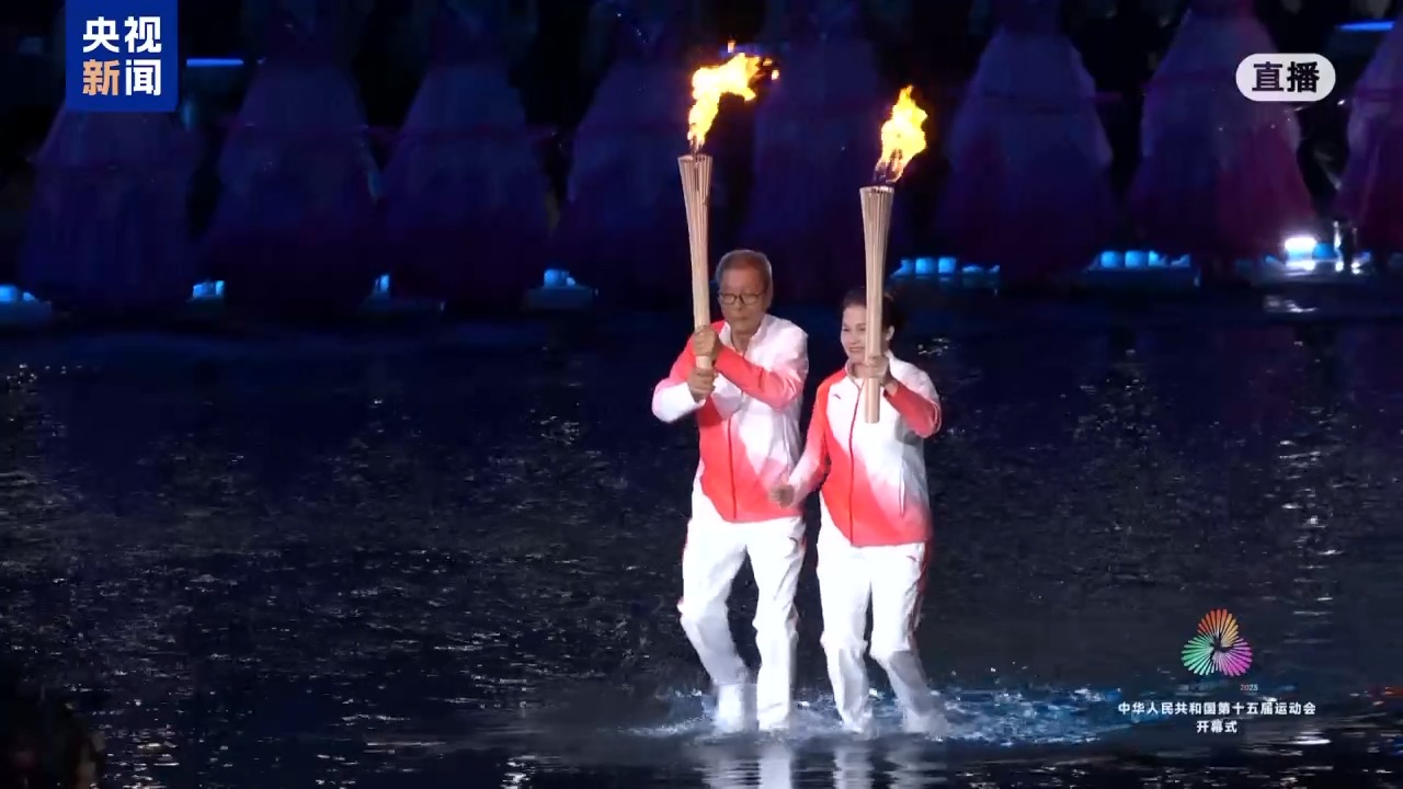 11月9日20时,十五运会开幕式在广东奥林匹克体育中心举行。在开幕式主火炬点燃仪式中,来自全国的优秀运动员代表手持采自南海1522米深处的圣火踏浪而来,经过传递,最终由来自粤港澳三地的火炬手苏炳添、张家朗、李祎最终共同点燃圣火。