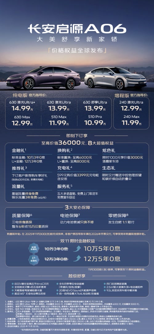 11月9日,长安启源A06正式上市,推出6款纯电及2款增程车型,纯电版官方指导价10.99万元至14.99万元,增程版售价11.99万元至12.99万元,较预售价直降1万元。
