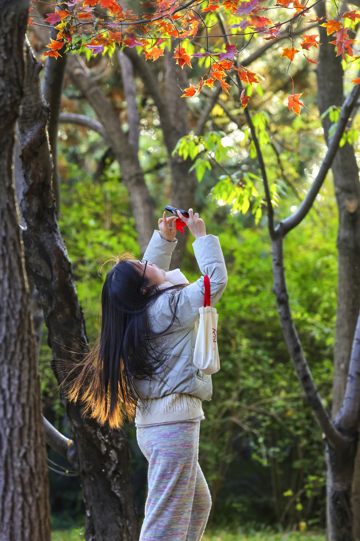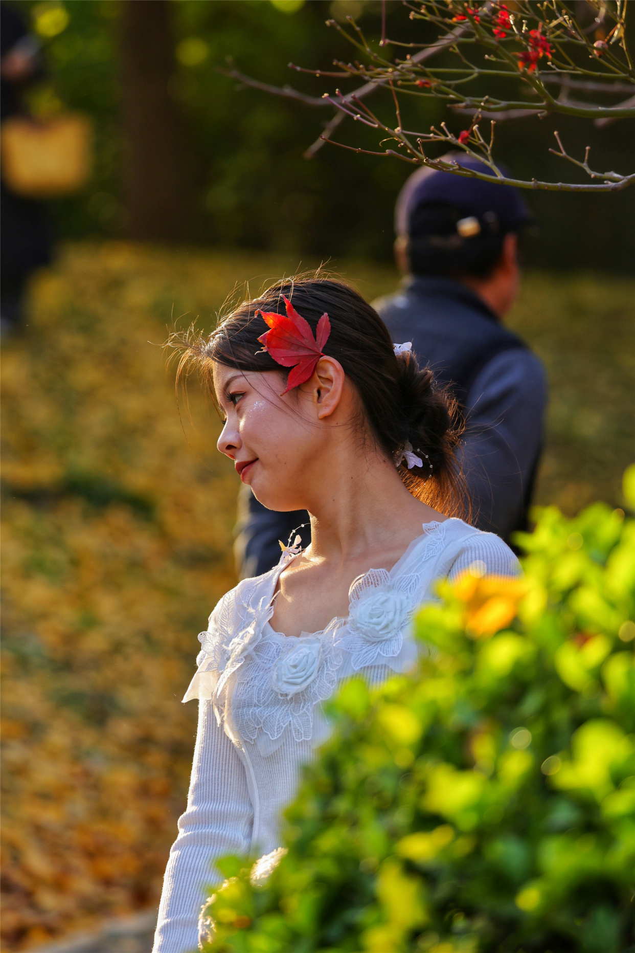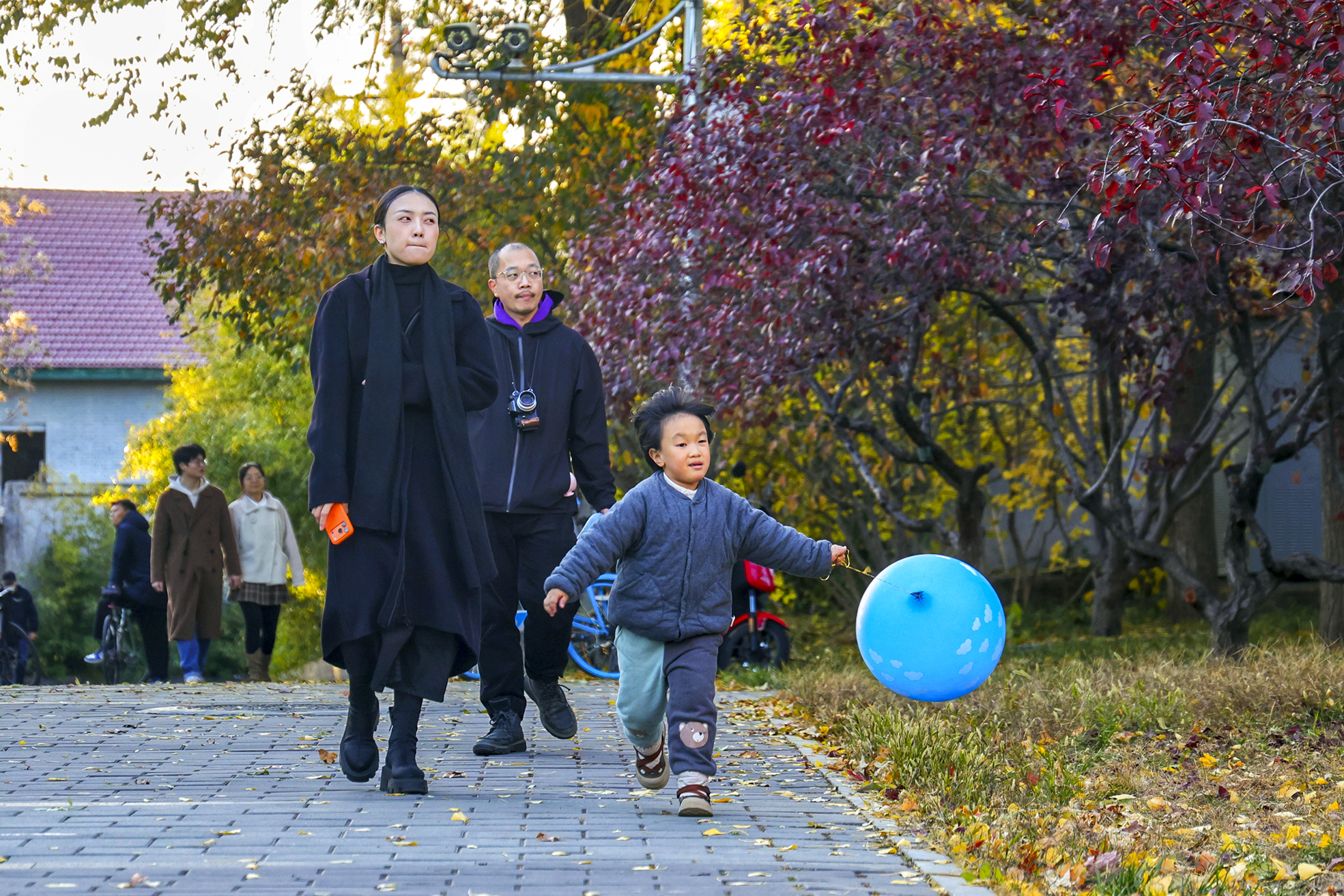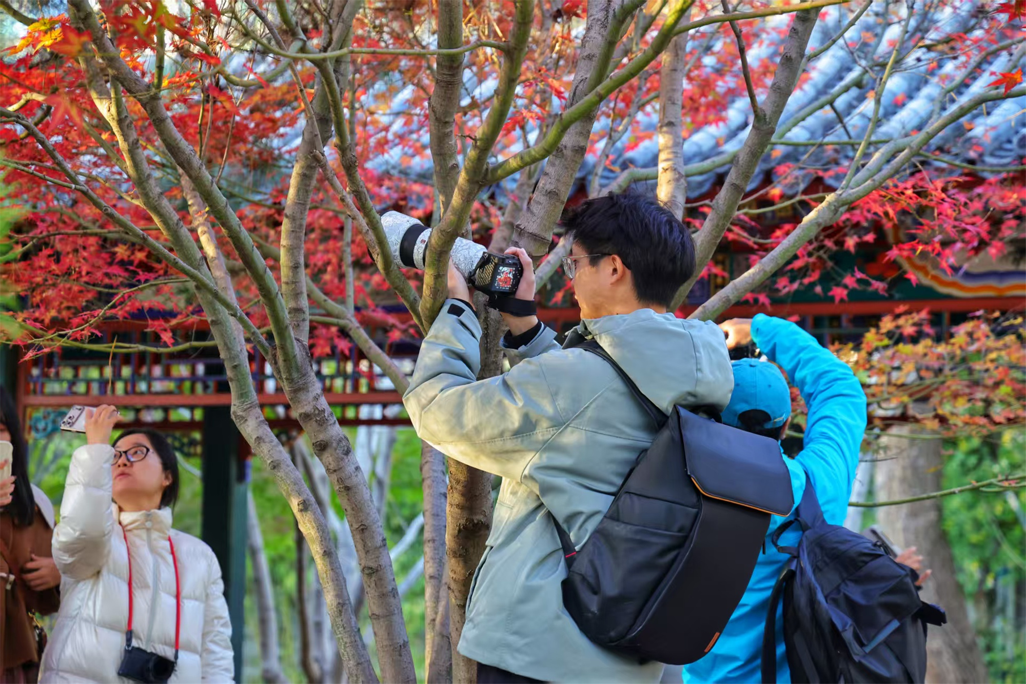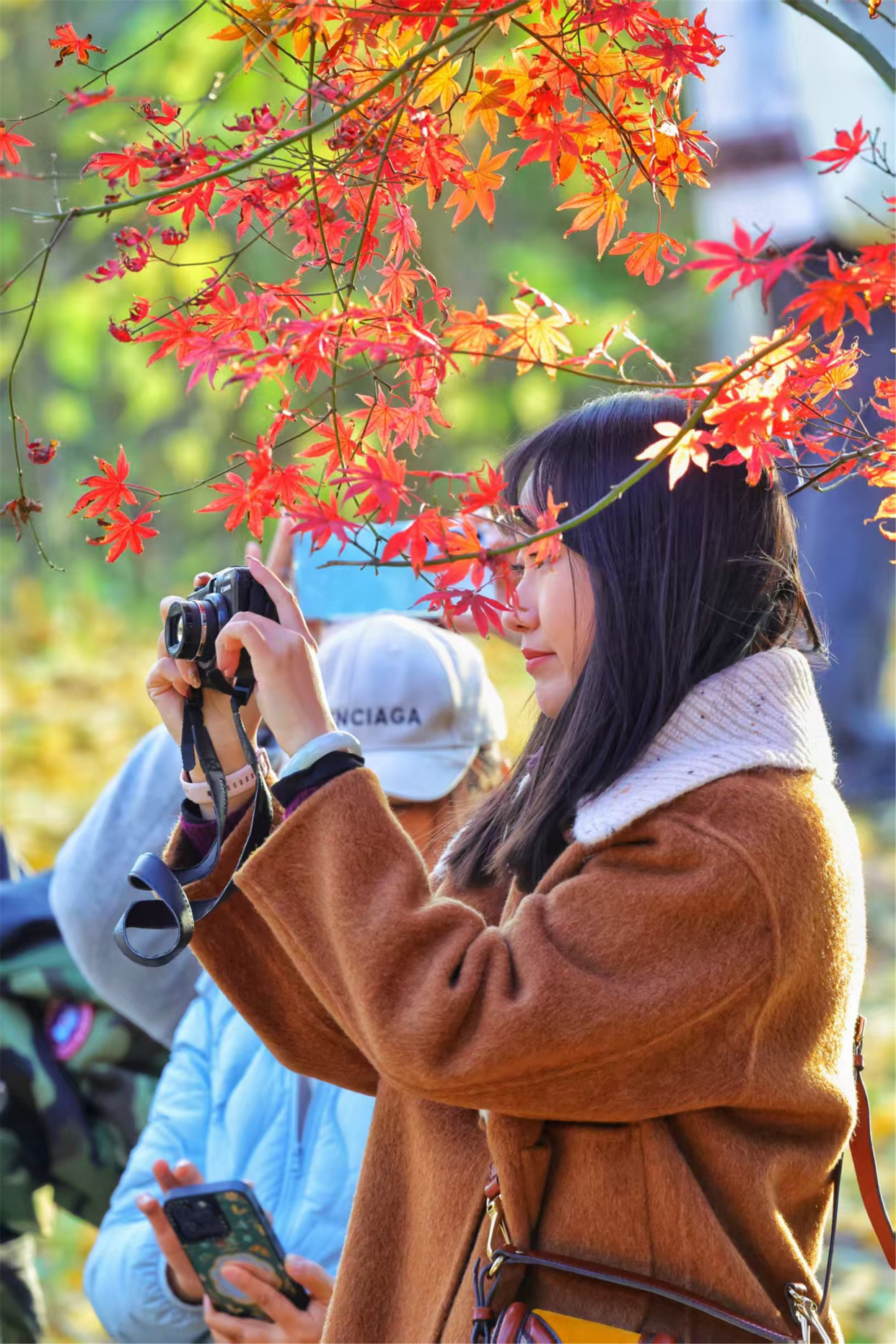 叶落满地最是动人——银杏铺就的“金毯”从墙根蔓延,踩上去沙沙作响,枫叶与红栌点缀其间,共同织就斑斓锦缎。