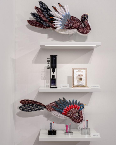 与此同时,展区亦呈现一系列迪奥美妆的可持续创新成果。美妆行业长期面临着包装材料消耗量大、一次性包装物过多等行业共性的环境挑战。包括迪奥旷野系列、迪奥花秘系列及迪奥魅惑唇膏系列的可替换装设计版本被带到了本次进博会的展台上。通过可重复使用的瓶身与补充装系统,有效减少了一次性包装浪费。这些可持续美妆产品的开发,体现了迪奥在保持产品品质与使用体验的同时,通过创新设计推动行业向更环保方向发展的实践探索。