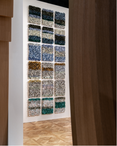步入迪奥展区,首先映入眼帘的是法国艺术家乔尔·安德里亚诺马里索亚(JOËL ANDRIANOMEARISOA)创作的大型装置艺术品“LES SAISONS IMAGINAIRES”。这件作品以其独特的艺术语言,在极具现代感的展陈空间内构筑出一道令人瞩目的视觉景观。作品取自品牌往季回收的近千条真丝丝巾,通过艺术家的匠心独运,将这些承载着时尚记忆的材质装裱于多块展板之上,形成层叠交错、富有诗意的艺术表达。