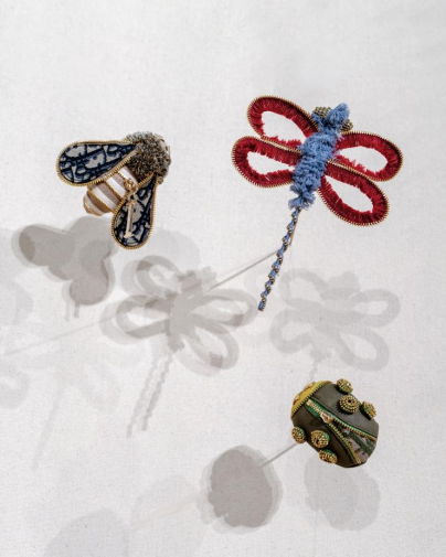 尤为凸显创意的一环,是迪奥对废弃材料的再生利用。工坊中的面料余料与升级再造材质,在能工巧匠的剪裁与缝制下,化作小狗、昆虫、猫头鹰等生动造型的艺术摆件。这些俏皮而富于想象力的作品,不仅演绎出大自然的灵动气息与匠心工艺的融合,也通过对废料的创意重构,实现了资源循环的最大化。据报道,迪奥在橱窗设计与视觉陈列与秀场置景中亦已全面推行回收利用:品牌将工坊余料、废弃装饰零件与旧金属件等材料再次投入橱窗制作,通过“旧物再造”的方式打造出别具匠心的展示空间。