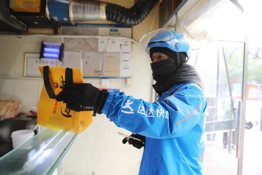 外卖骑手到店内取餐。