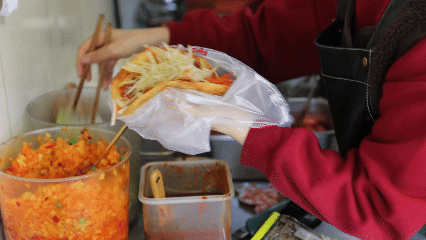 随后师傅将烙得半熟的饼送入旁边的烤炉,“烤炉能把饼芯的水分锁住”,师傅边等边说:“先烙定型、再烤增脆,饼皮才会外脆里软,咬着有层次感。”5分钟后取出时,饼皮边缘已泛着琥珀色的脆边,他拿起刷子蘸上特制酱汁,手腕一转就刷得均匀,再抓一把葱花撒上去,动作利落得不带半点停顿,不到一分钟,一个热气腾腾的鸡蛋灌饼就递到了上班族手里。咬一口,脆皮下的蛋层软嫩,酱香裹着葱香,早起赶路的疲惫都被这口热乎气冲散了。