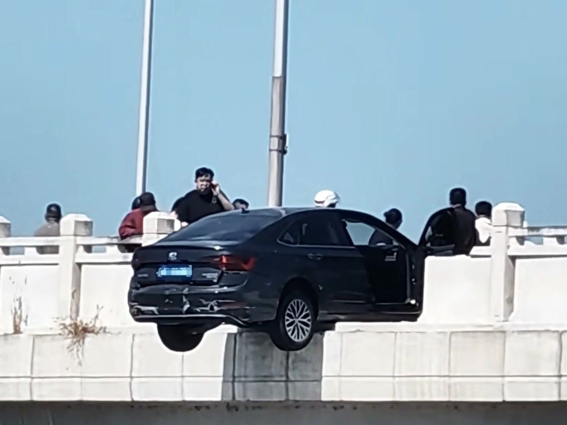 ▶ 卢沟新桥上,轿车撞断护栏空中半悬!“制服小哥”压车救人