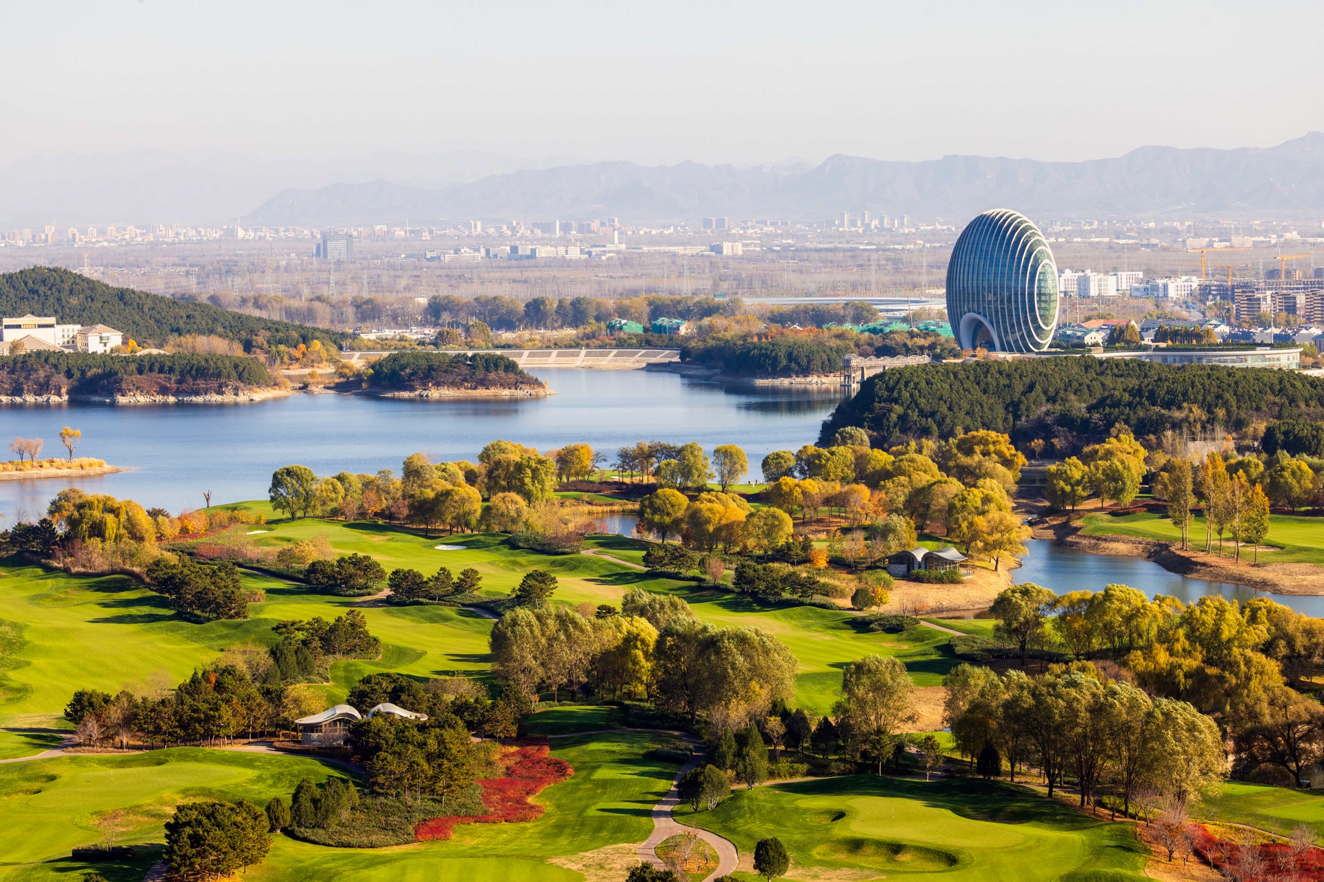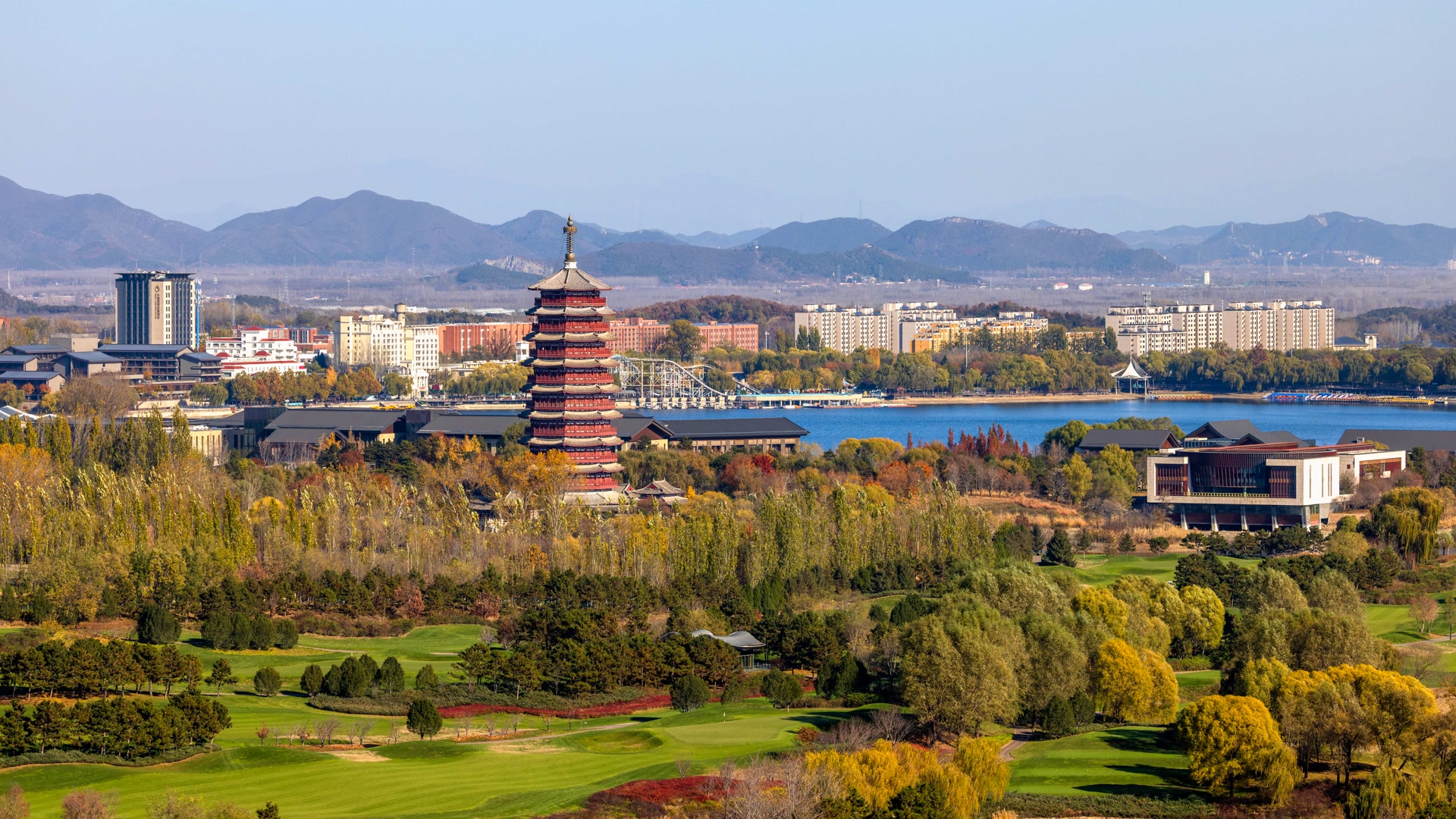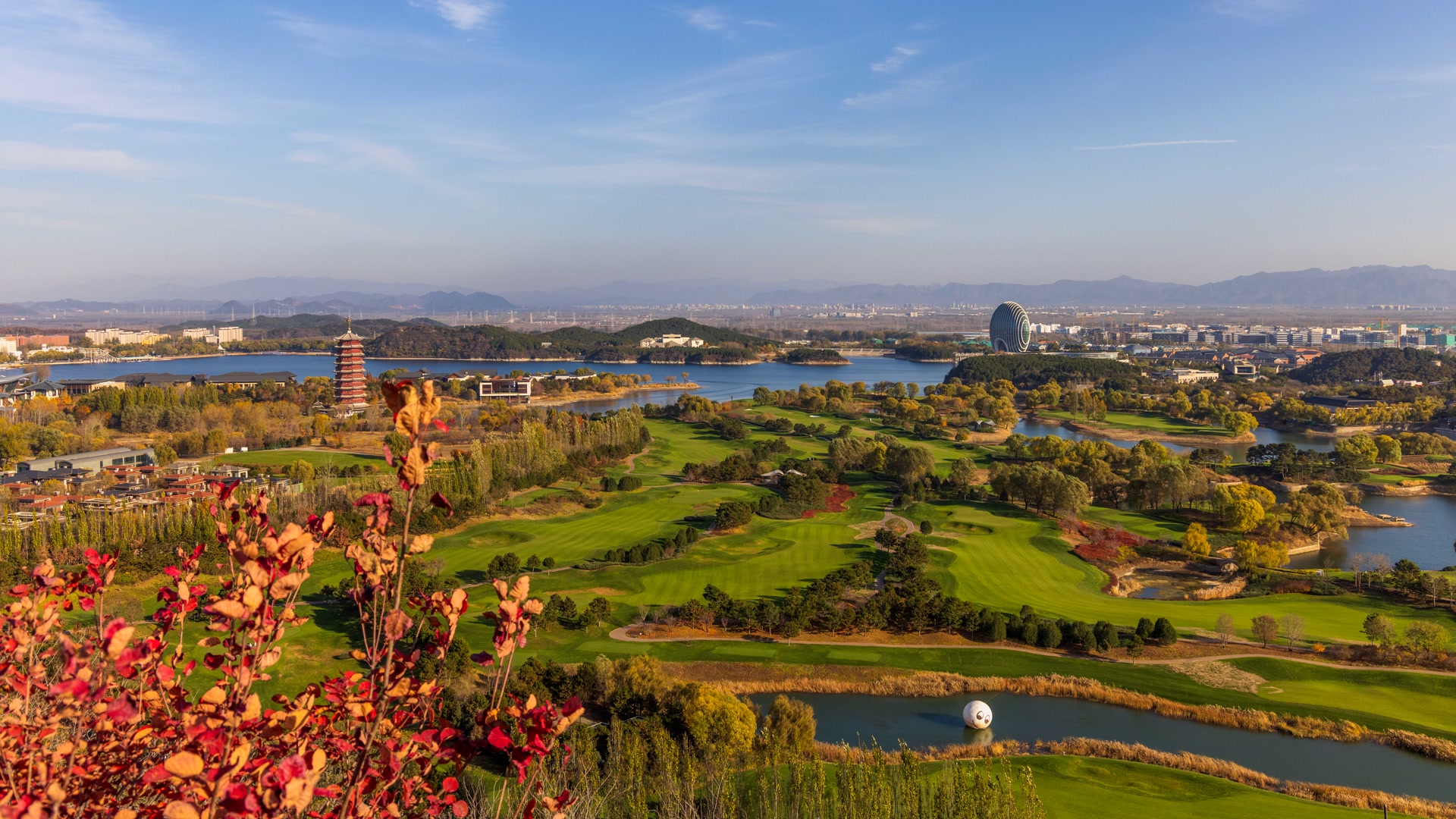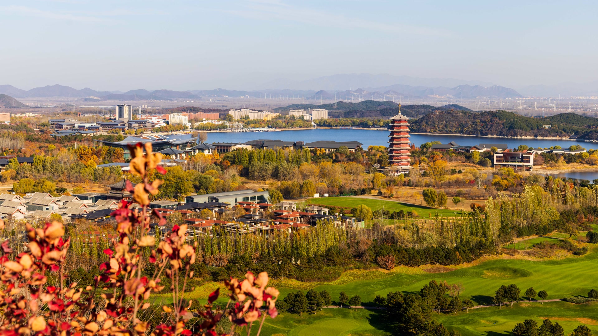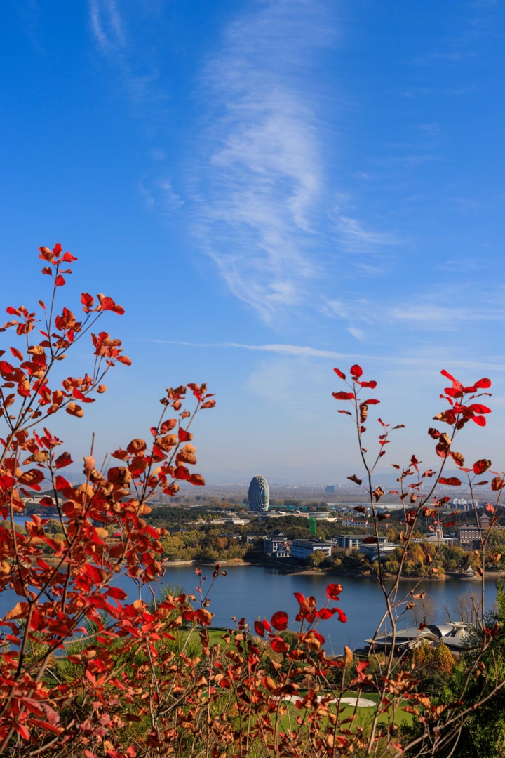 11月10日,雁栖湖第五步道如油画,制高点处湖光山色、古塔、酒店交融,自然与人文共绘视觉盛宴。