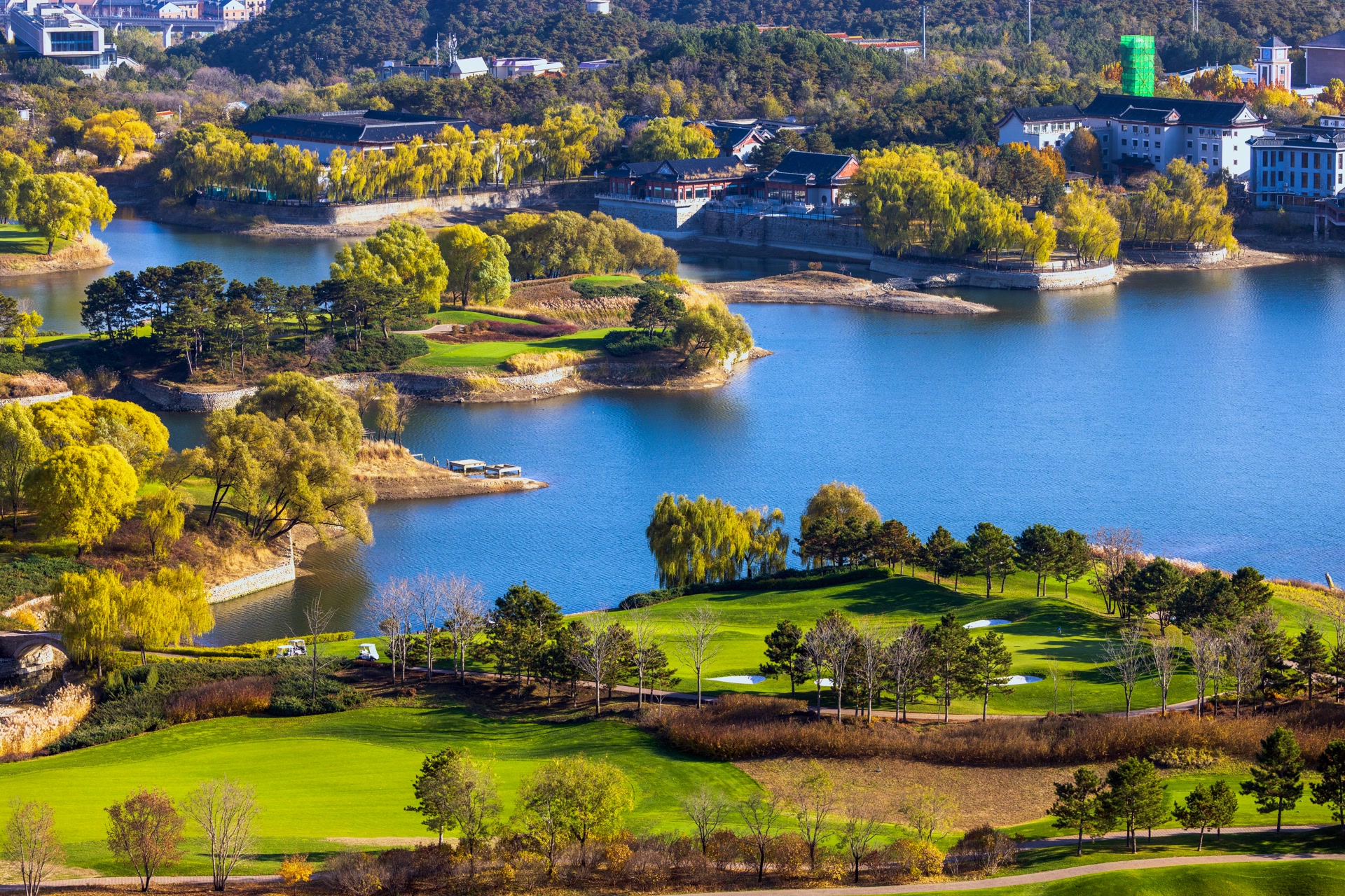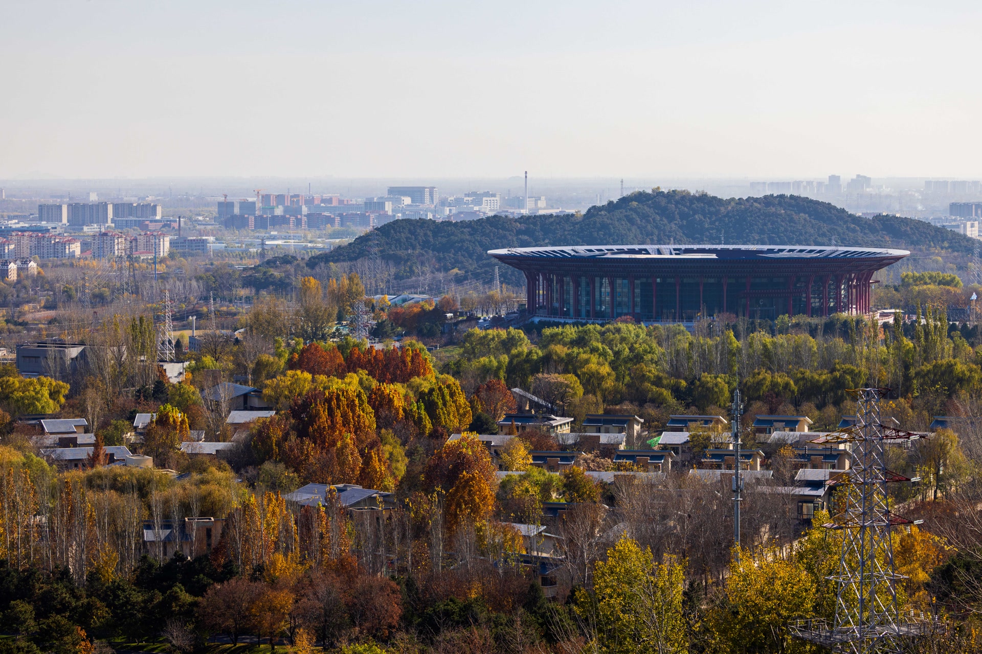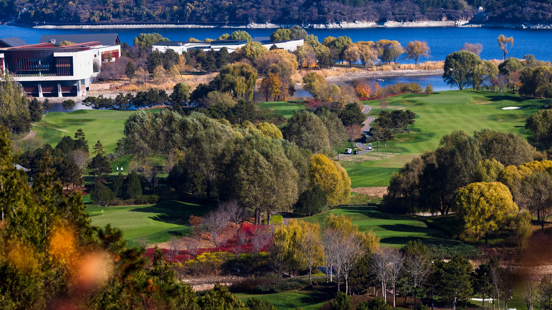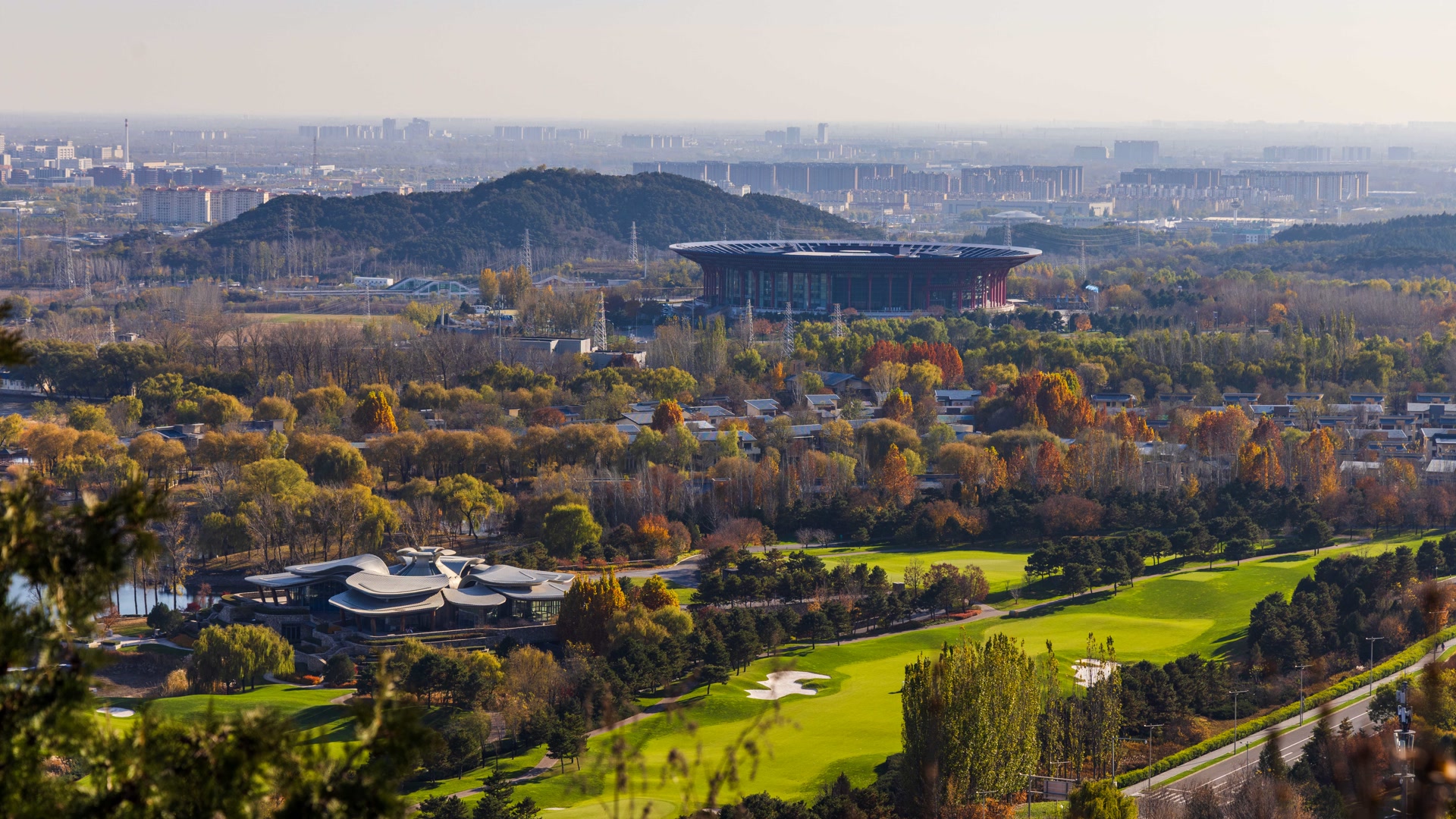 11月10日,雁栖湖第五步道如油画,制高点处湖光山色、古塔、酒店交融,自然与人文共绘视觉盛宴。