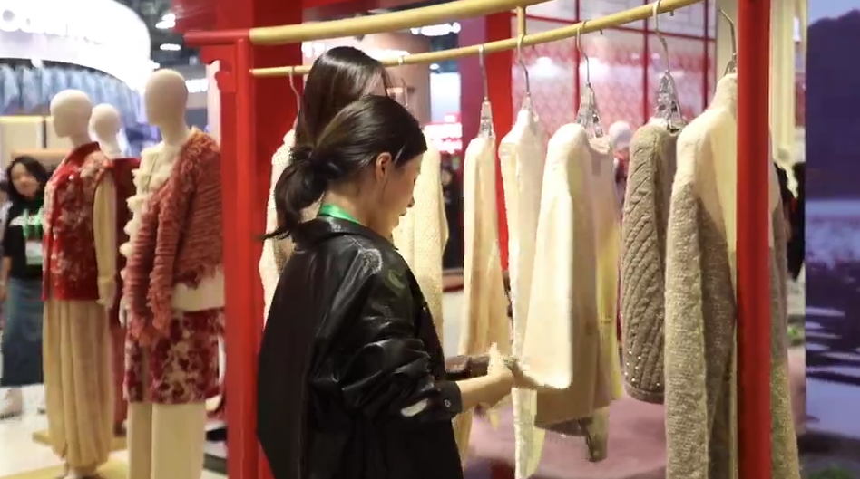 “今年我们通过针织的形式,把羊绒衫这个单体变成一个时尚款式。同时,我们精纺的超薄120克羊绒面料,目前这在国内是首创。”康赛妮集团展馆负责人徐君秋说道。