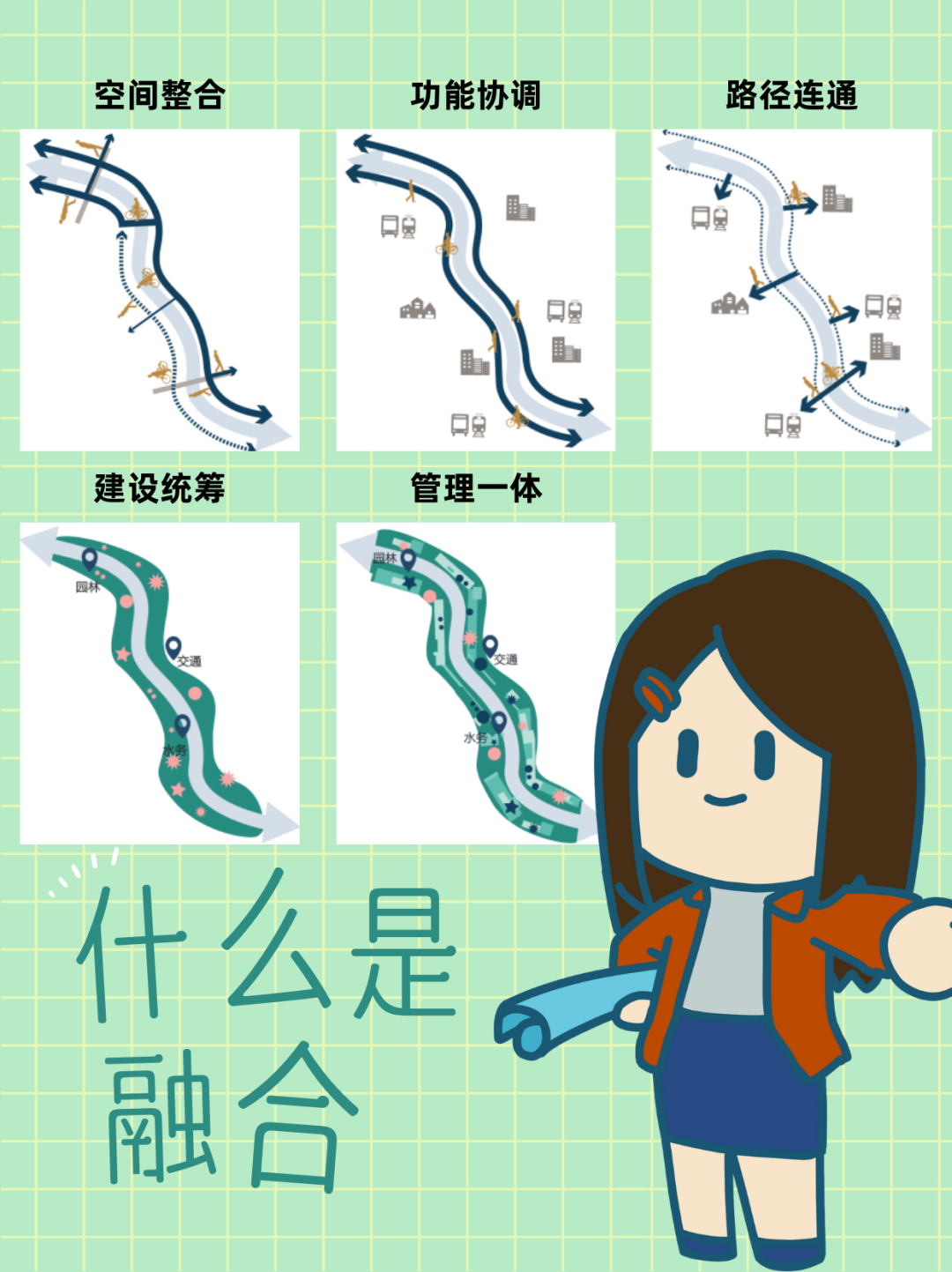 融合是指城市道路慢行系统、绿道与滨水慢行路通过相互连通、空间整合、功能协调等方式,强化一体化规划设计,提升整体效能。