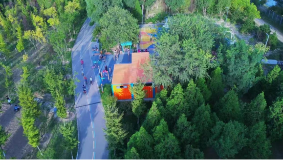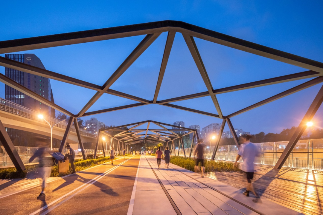 北京银行保险产业园投资建设了跨越城市道路的空中步行桥,步行桥自北向南跨越金府南路并与南侧的公园内步行道相接,继而可通过公园内的园路与巡河绿道相连,实现了产业园与南侧公园及滨水慢行空间的无缝连接。