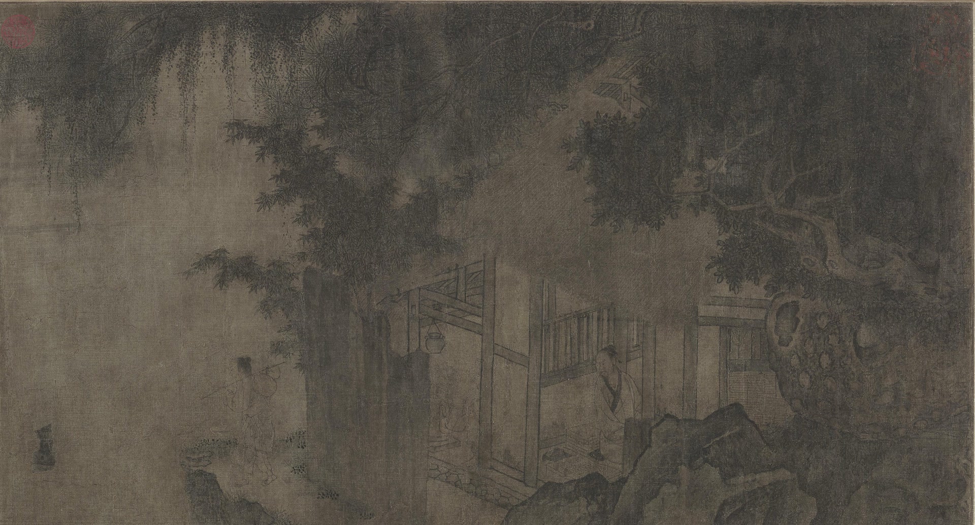 《卢仝烹茶图卷》的作者传为刘松年。刘松年是南宋宫廷画家,为“南宋四大家”之一,跨越孝宗、光宗、宁宗三朝。《卢仝烹茶图卷》共描绘了三个人:主角卢仝居于中心,一仆一婢分司其职,构成完整的叙事场景。画卷徐徐展开,梧荫松石间,一座破旧木屋映入眼帘。卢仝安坐于屋前书卷与茶几之间,正侧身回首,神态专注。画面左下角点出仆役的活动——一人肩扛葫芦,正往山溪而去,为烹茶备水。檐下所悬双耳茶釜,与后方若隐若现、手持葵扇的老妪形象巧妙呼应,共同烘托出主人公超然物外、寄情茶书的野逸情趣。