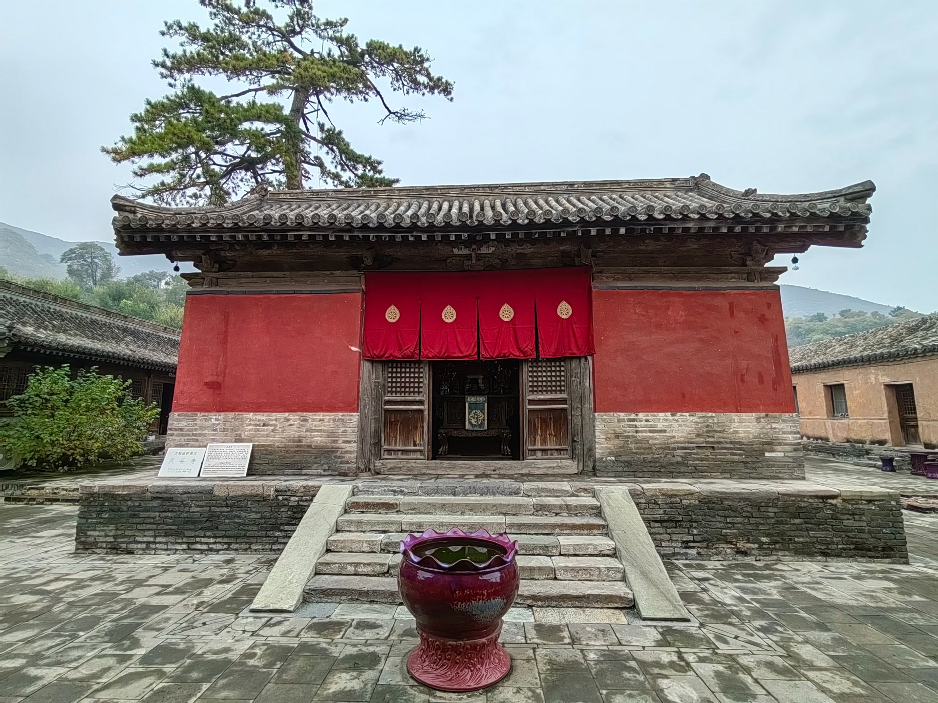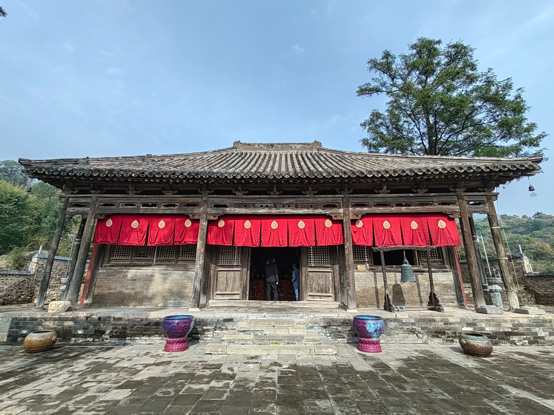 灵岳寺的核心建筑大雄宝殿采用了庑殿顶,这种四面斜坡、一条正脊和四条斜脊、并且四面皆为曲面的屋顶,在古代建筑中属于等级最高的屋顶形式,只有皇宫及寺庙中最主要的殿宇才能使用。大殿建在青石台基上,面阔五间,进深四间,看上去气势宏伟。站在大殿下仰望,斗拱如云朵,一层层撑着屋顶,那是中国古代建筑的灵魂。灵岳寺的斗拱不如故宫的斗拱华丽,却简洁有力。斗、拱、昂三件套,一根钉子没有,全靠木件咬合,并将屋顶力道传递到柱子上。据说,这是典型的元代建筑风格,也是藏在庑殿顶上的元代建筑密码。