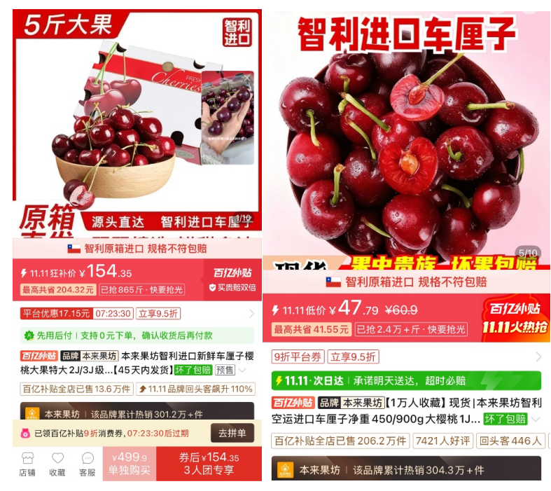 其二,提升大果供应量,推出“规格不符包赔”等服务,联动平台“百亿补贴”、秒杀、多人团等资源,加码补贴品质车厘子,真金白银助力消费者平价尝鲜;