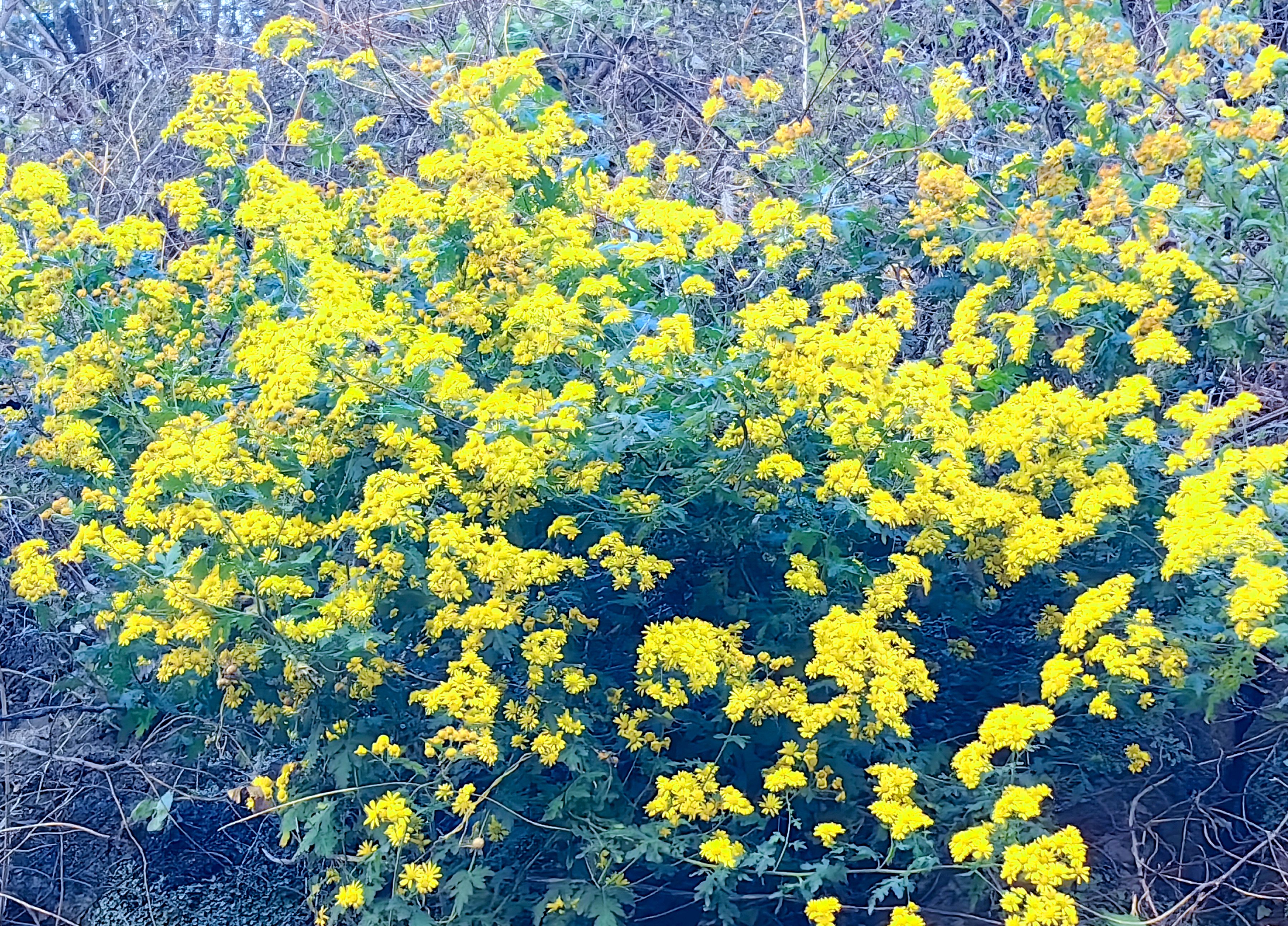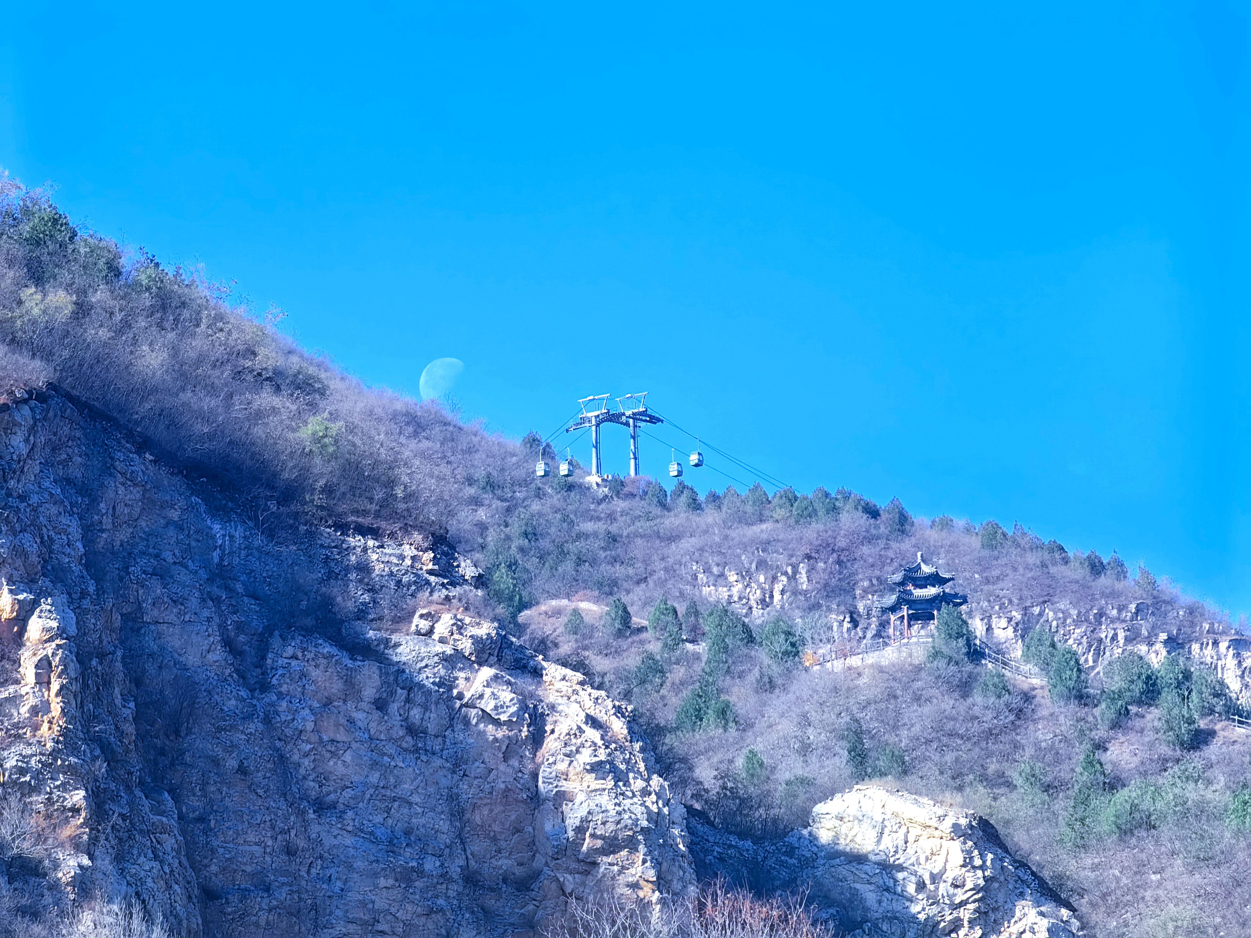 虽然已过立冬节气,但是,此时的千灵山,正铺展着秋日长卷。浅黄、橙红、深绛的枝叶在山间交织,山风拂过,落叶轻舞,满是秋的诗意。来到千灵山可以沉浸层林尽染,可以登高望远,可以探索历史遗迹……也可以到题写“千灵山”石壁对面的山坡观赏盛开的野菊和形形色色的地钱。眼下,许多花草已经退场,而千灵山野菊独自开放,散发着淡淡的幽香。野菊下面是紧贴着地皮生长的地钱,嫩绿的叶片构成不同的图案。黄色的野菊和绿油油的地钱成为千灵山一抹立冬后的秋色。