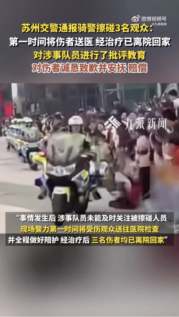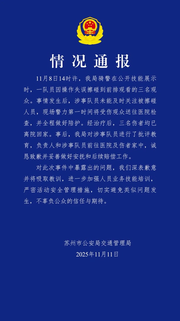 11月11日,苏州市公安局交通管理局发布关于“表演骑警撞倒3名观众”的情况通报。