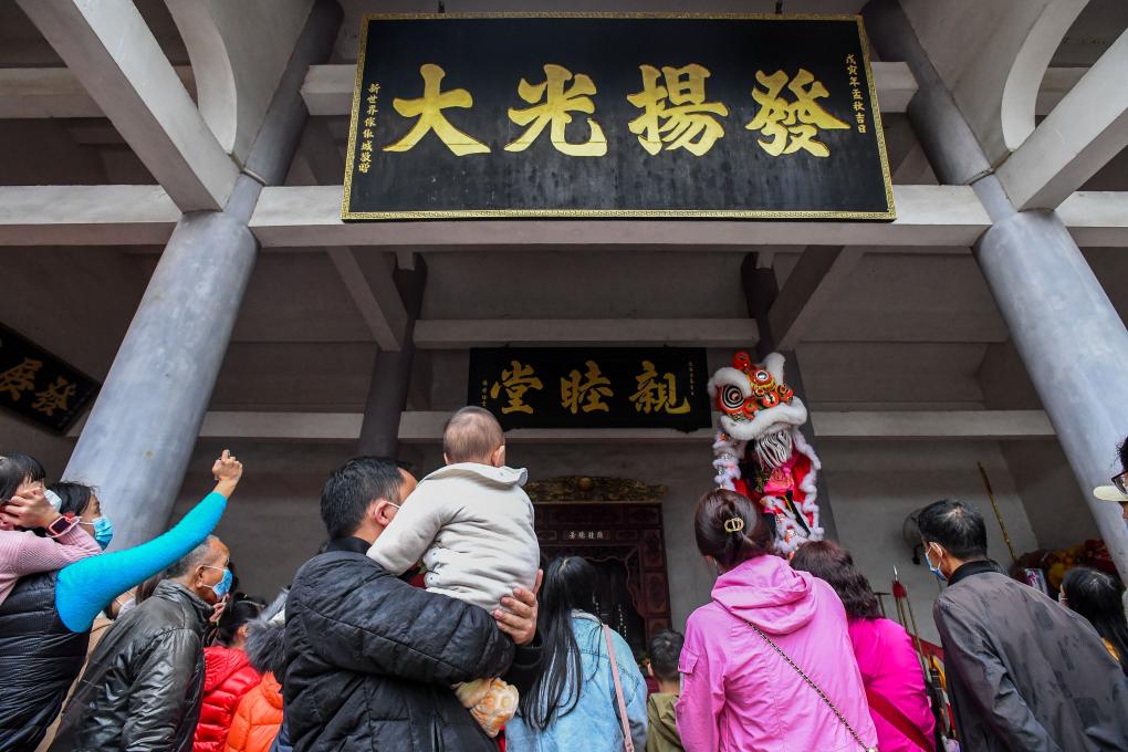 2023年1月12日,在佛山市南海区西樵镇西樵山牌坊,人们争相目睹高4.68米、宽4.5米的“狮王”狮头。新华社记者 刘大伟 摄