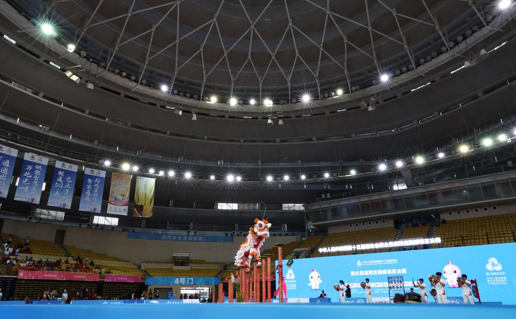 2025年11月11日,河南队在第十五届全运会群众展演舞龙舞狮项目南狮自选决赛比赛中。新华社记者 王鹏 摄