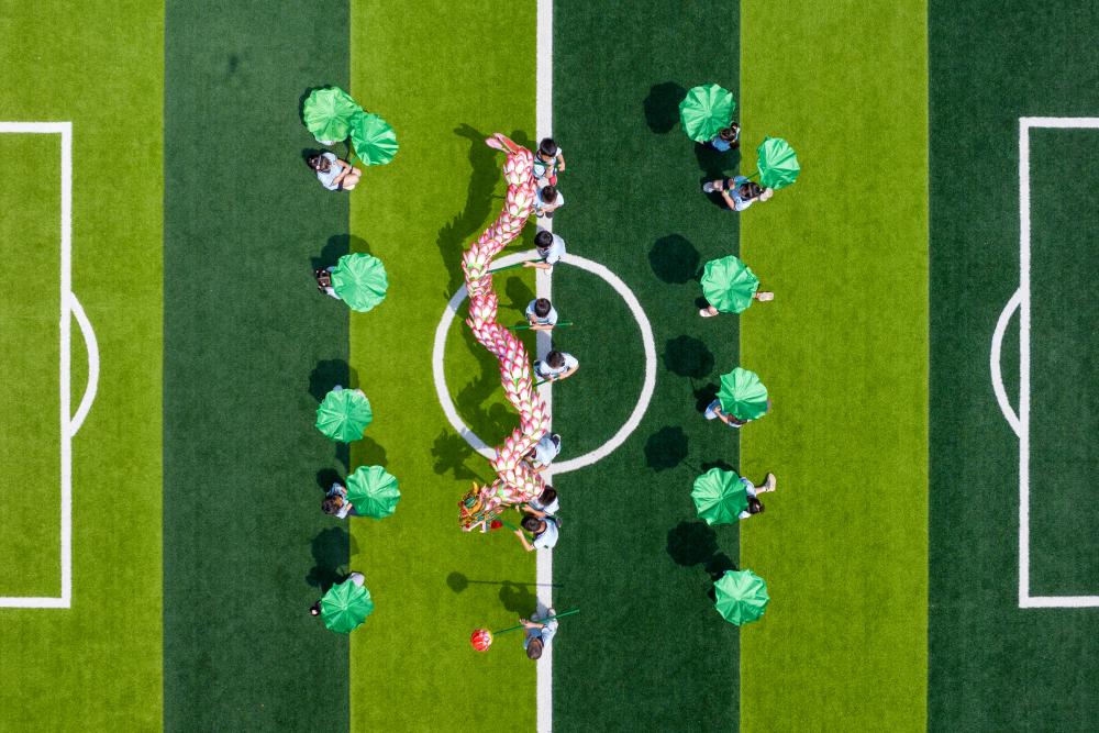 2025年5月26日,浙江省湖州市长兴县林城镇中心幼儿园开展的“品民俗 迎端午”活动中,孩子们体验舞龙。新华社发(谭云俸摄)