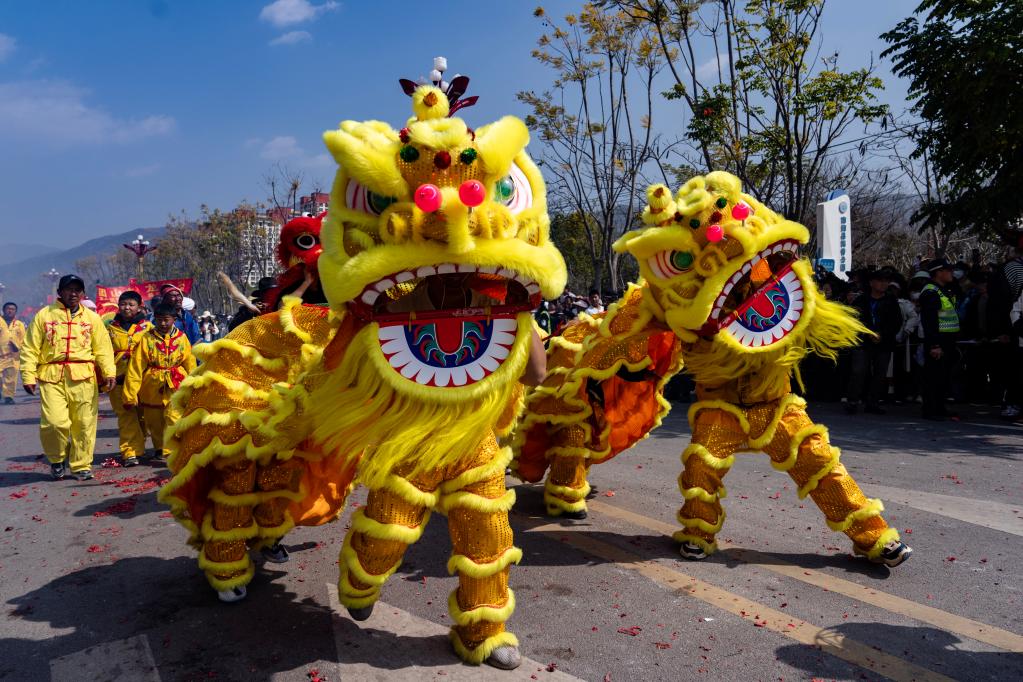这是2025年1月29日在广东省佛山市祖庙黄飞鸿纪念馆前拍摄的醒狮巡游表演。新华社发(黄继明摄)