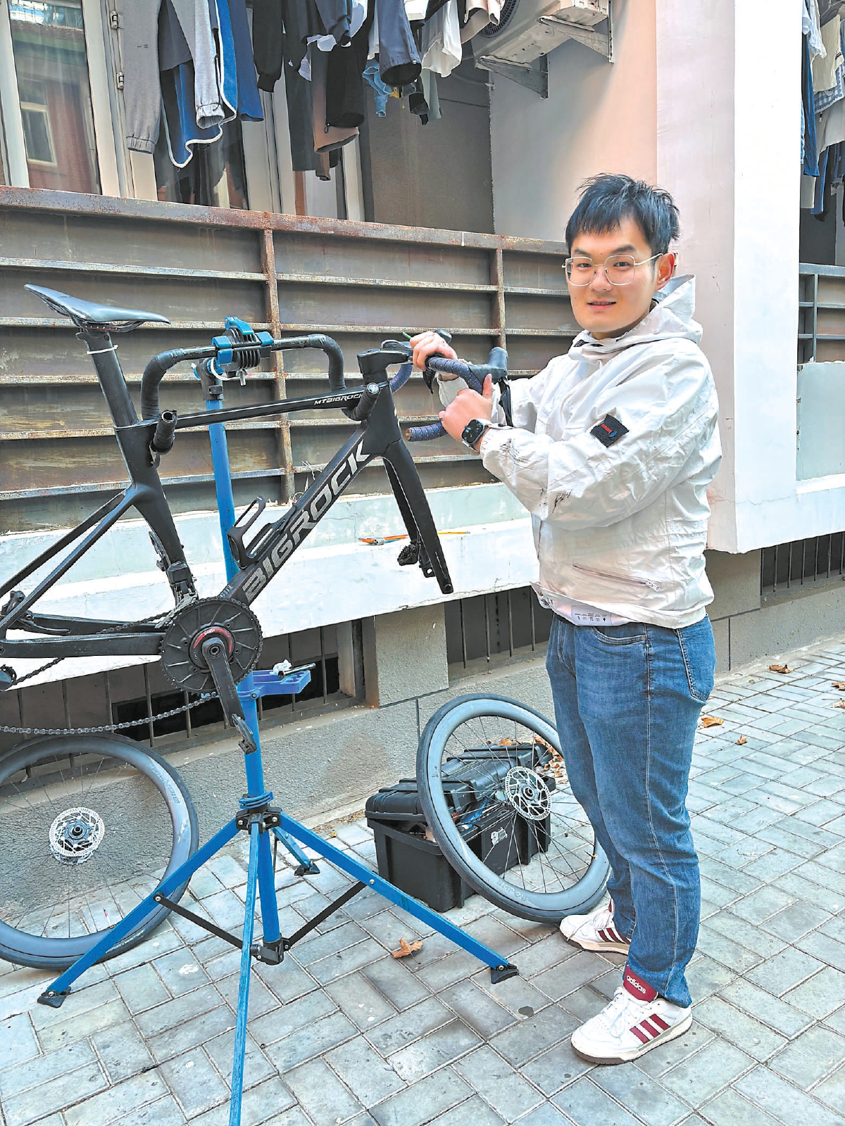 跟随他的脚步,北青报记者来到男生宿舍楼下一角。几平方米的空间被打造成功能齐全的小型维修点。神兴隆从一侧拖出黑色工具箱,利索地打开几乎与人等高的折叠维修支架,稳稳立好后,转眼就把公路车“上架”开修。