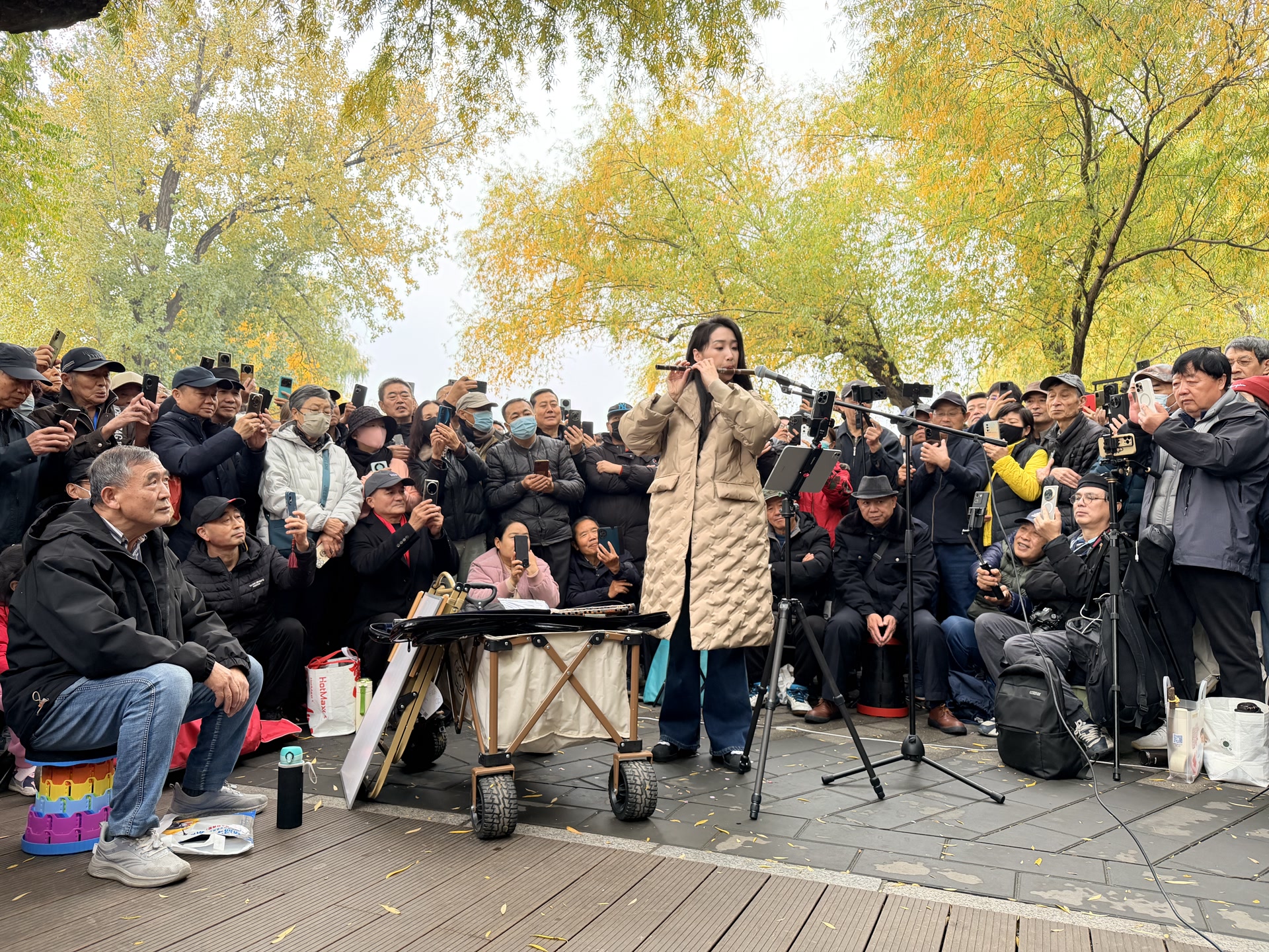 “好!”潮水般的掌声在紫竹院公园鸽子广场回荡。11月10日上午,来自中国歌剧舞剧院的孙楚泊吹奏的一曲《扬鞭催马运粮忙》刚收尾,围得密不透风的两三百名观众便爆发出满堂喝彩。站在人群中央的她手持竹笛,笑意盈盈地向大家致意。