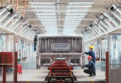 近来,三一智造基地等一批民间投资重点项目如火如荼推进,持续为湖南经济社会发展注入新动能。图为湖南省长沙市三一智联重卡产业园内的生产场景。新华社记者 余春生摄