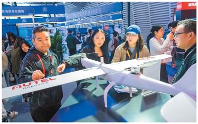 11月6日,2025年世界互联网大会“互联网之光”博览会现场,观众参观无人机。杨梅清摄(人民图片)