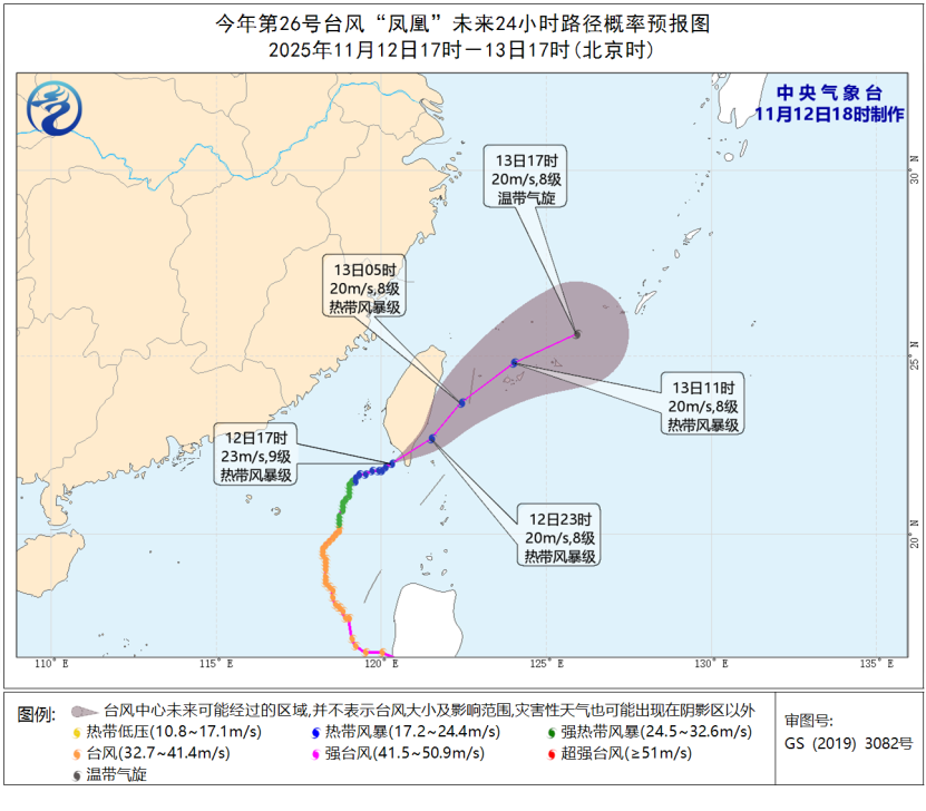 预计,“凤凰”将以每小时20-25公里的速度向东北方向移动,即将于今天晚上在台湾岛西南部沿海登陆(热带风暴级,8-9级,20-23米/秒),自西向东穿过台湾岛南部,随后将在台湾岛东侧继续东北行,并逐渐变性为温带气旋。