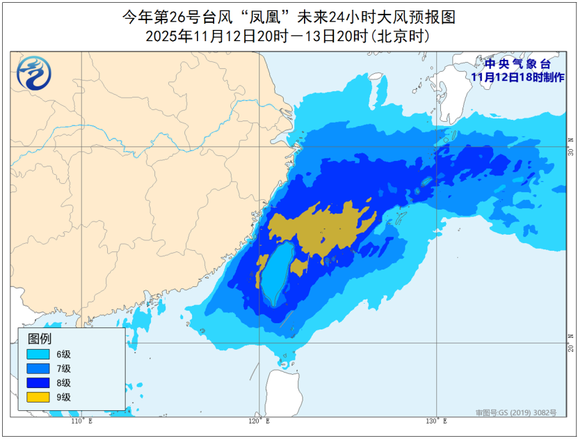 大风预报:12日20时至13日20时,受台风和冷空气共同影响,东海大部、台湾海峡、台湾以东洋面、巴士海峡、南海东北部、浙江沿海、福建沿海、台湾岛沿海将有6-8级、阵风9-10级的大风,其中,东海南部、台湾海峡和台湾以东洋面的部分海域风力可达9级,阵风10-11级。