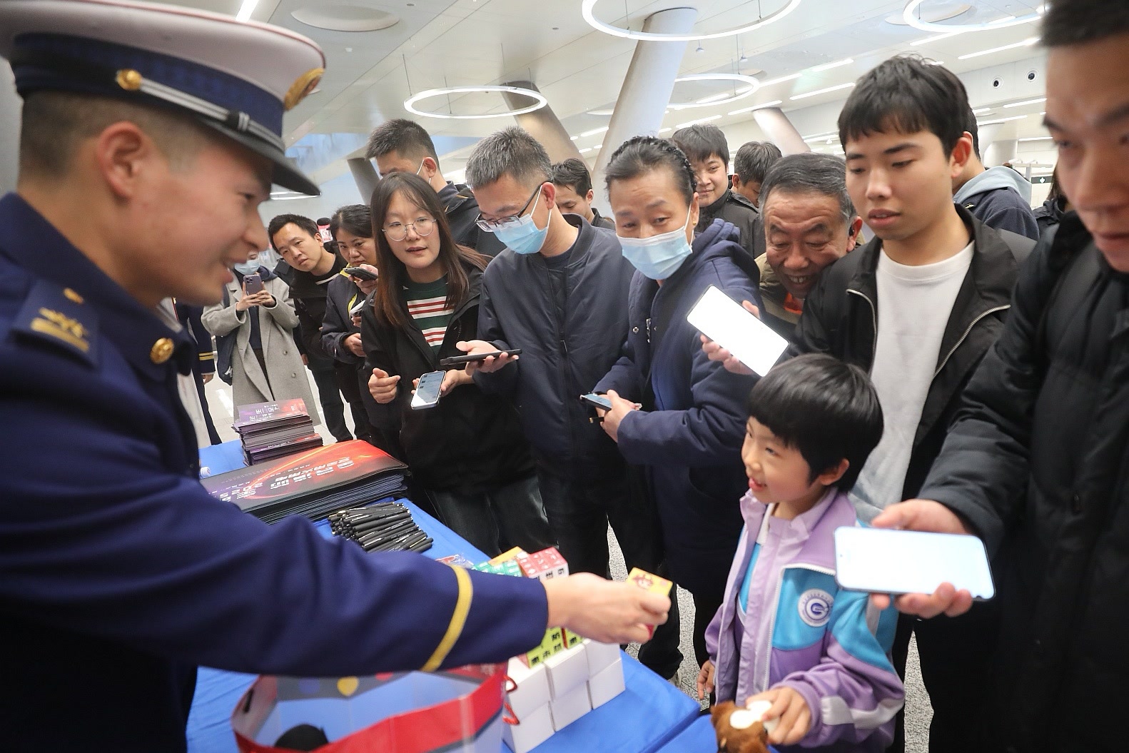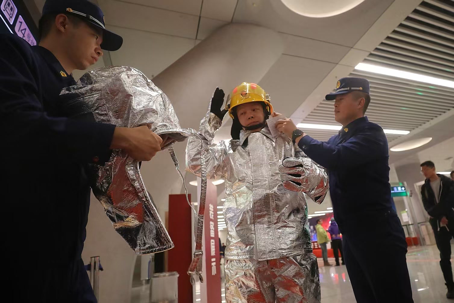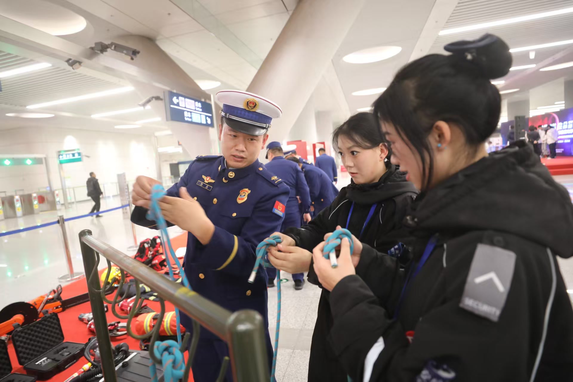 今天的活动中,北京轨道交通消防对2025年轨道交通系统积极参与消防公益事业、表现突出的“火焰蓝贴心人”,以及自防自救力量先进个人及单位进行了表彰;活动现场还设置装备展示区、科普教育区、有奖问答区、趣味打卡区等多个互动区域,工作人员通过装备展示、有奖问答、摆放展板等方式向过往乘客讲解地铁消防安全知识。