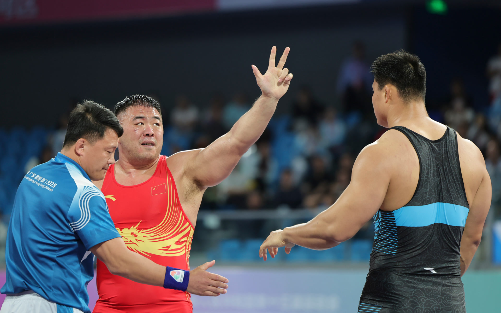 11月12日在清远体育中心体育馆,37岁的邓志伟拿下十五运会男子自由式摔跤125公斤级冠军,实现全运会该项目三连冠。