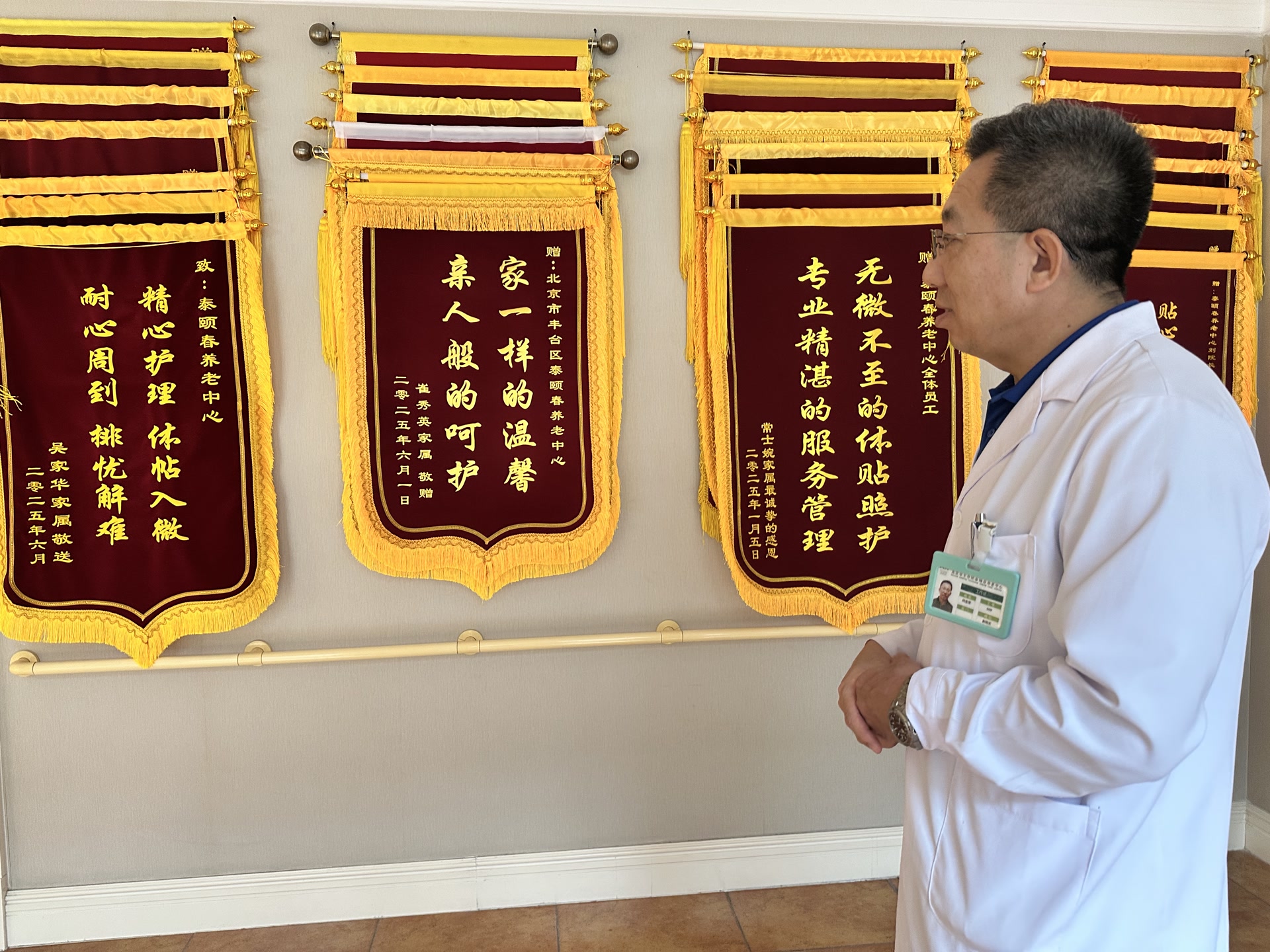 在泰颐春养老中心一楼,有一面锦旗墙。这里的锦旗许多是老人去世后,家属专门送过来的。“常奶奶是1937年的,属牛;崔奶奶是1933年的,属鸡;齐奶奶是1929年的……”看着锦旗上的名字,闫志军脱口而出。院里住过的每一位老人的年龄、特点,他都记得一清二楚。