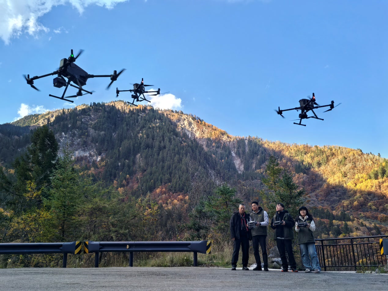 在九寨沟的青山绿水间,多套多旋翼无人机搭载多类型载荷腾空而起。科考队员围绕九寨沟世界自然遗产地植被生态景观变化、滑坡与崩塌地质灾害治理成效、基础设施韧性能力建设等方面,在多个区域实施多机协作飞行外业数据采集,开展了无人机遥感综合监测和卫星遥感解析结果的野外验证。