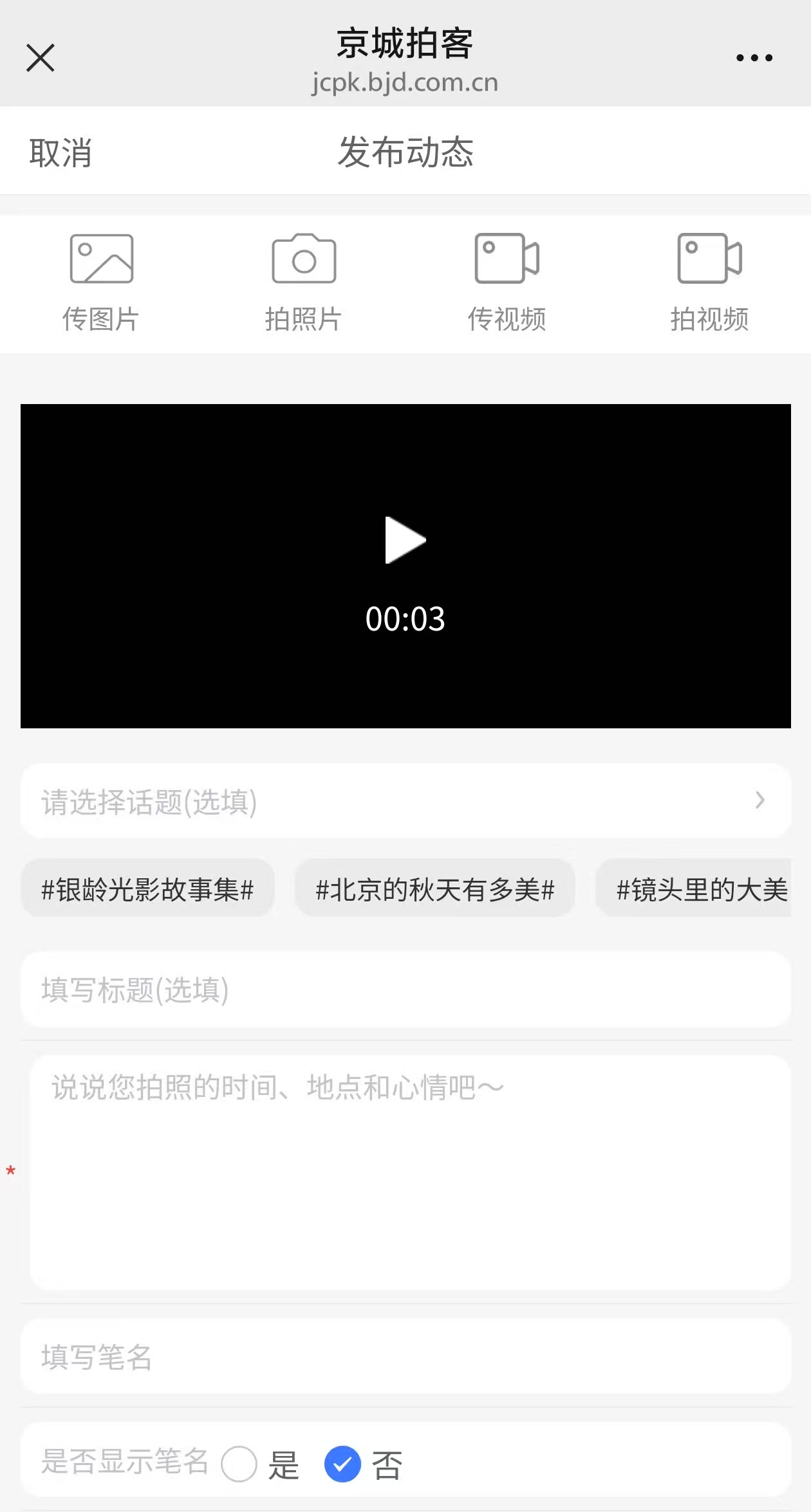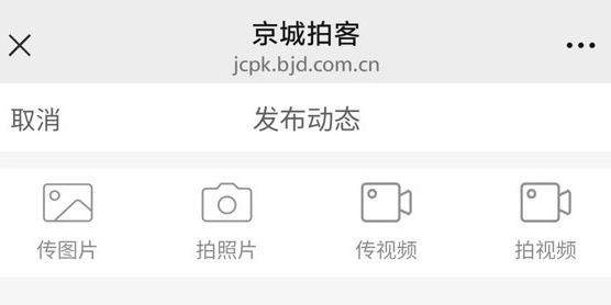 1、打开“京城拍客”小程序,点击“发布”按钮,上传作品