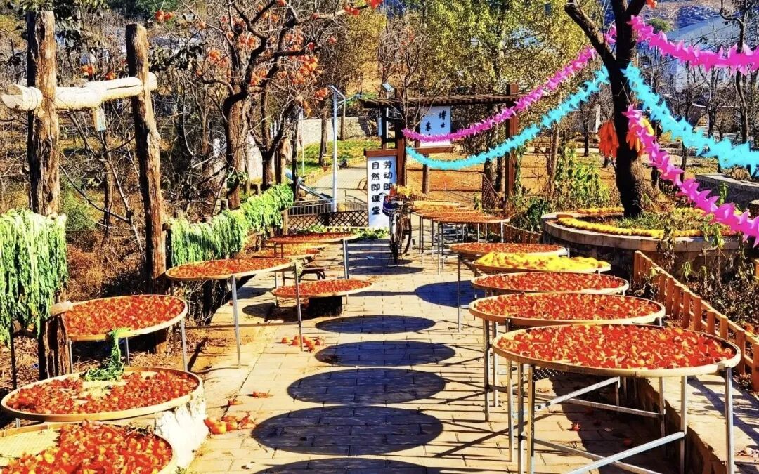 他们深耕鲜柿产业,开发出柿茶、柿酒、柿醋等高附加值产品,让百年柿林成为村民增收的“甜蜜产业”。大峪沟村的博士小院更让农耕文明焕发新活力:满院晾晒的金黄柿饼、火红辣椒,是传统“晒秋”的诗意表达;游客亲手晾晒柿子、制作柿子灯,在动手实践中读懂农耕传承的创新密码。