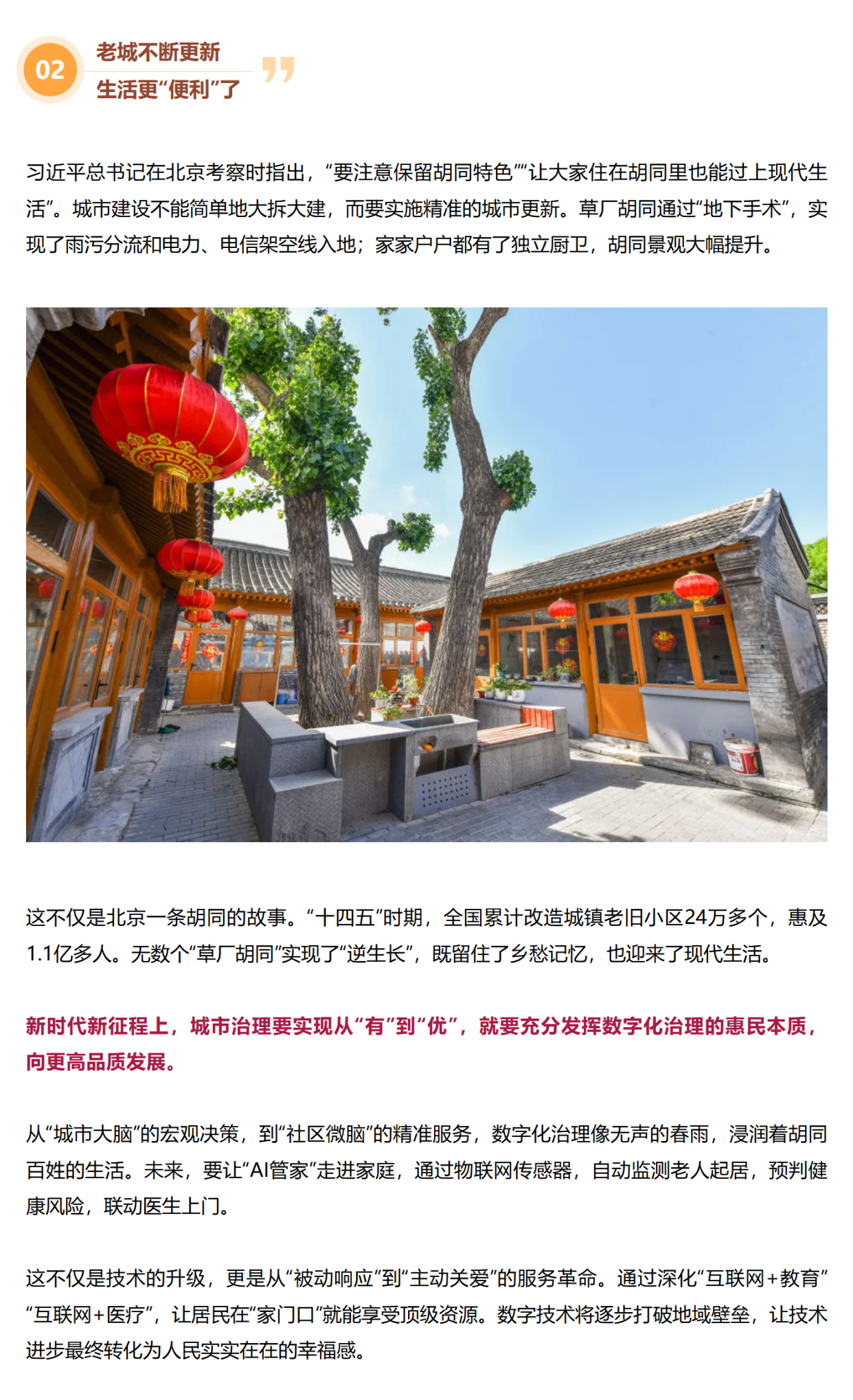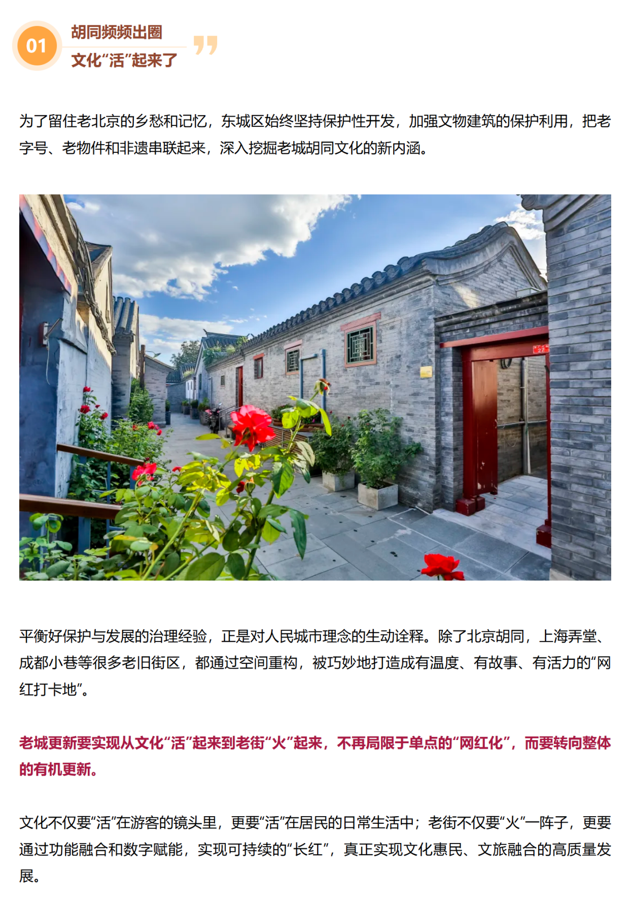 北京前门东区草厂四条胡同,是北京老城的重要历史片区。2019年临近春节,习近平总书记来到这里强调:“要把老城区改造提升同保护历史遗迹、保存历史文脉统一起来,既要改善人居环境,又要保护历史文化底蕴,让历史文化和现代生活融为一体。”