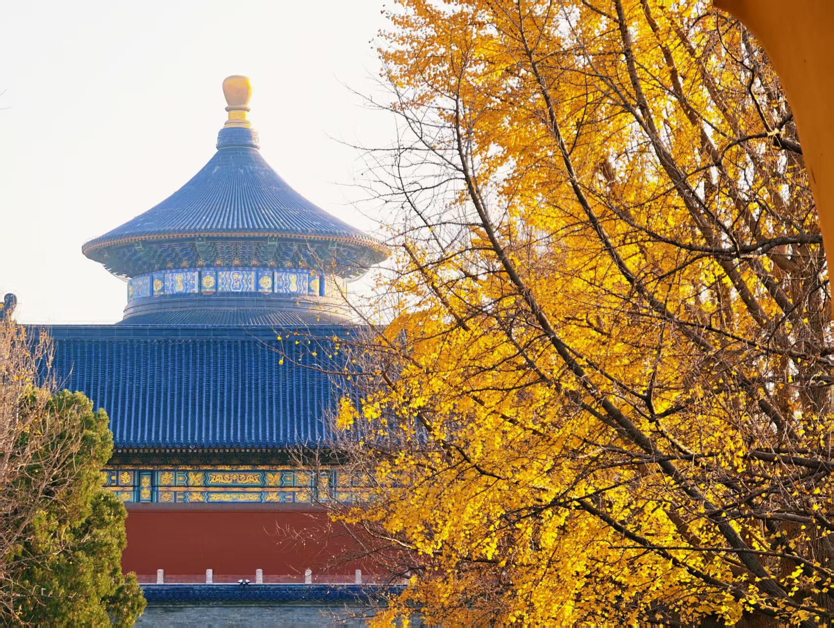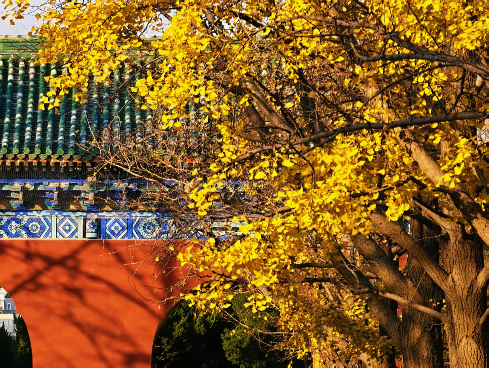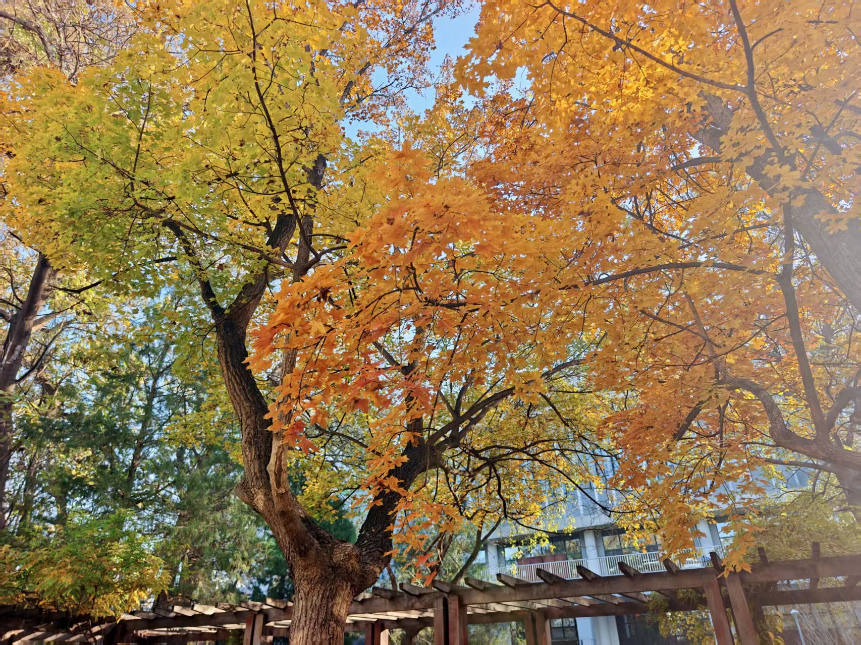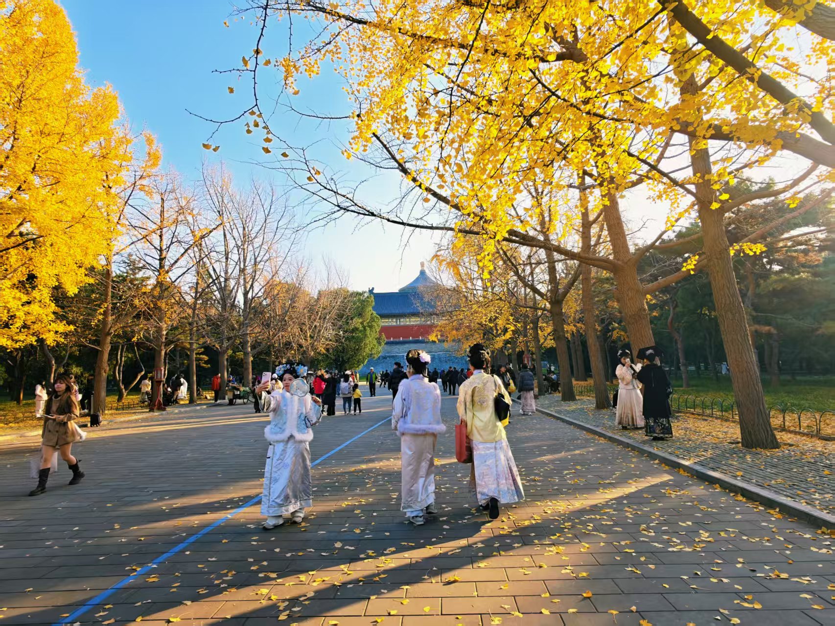11月14日,北京秋意惹人醉。城市公园层林尽染,色彩绚丽,游人行走其间,宛若走进了油画里。