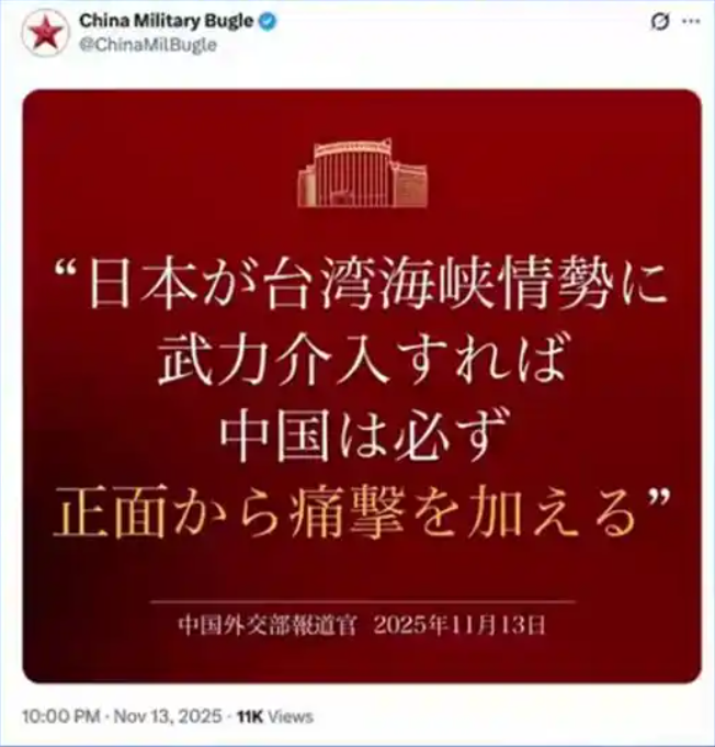 同日,中国军号在境外社交平台发布日语海报:如日方胆敢武力介入台海局势,中方必将迎头痛击!
