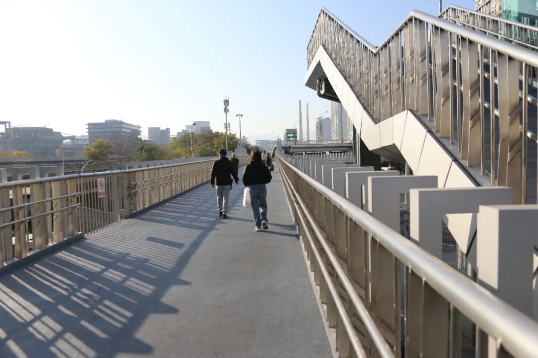 为提升出行效率,项目核心建设了“口”字形钢结构天桥,以实现三维立体换乘。主桥全长421.8米,四条主桥净宽均为4米。建设中融入多项人性化细节:15厘米高台阶、1:12缓坡梯道方便老人通行,8部自动扶梯、4部垂直电梯及盲道设施实现全人群无障碍换乘,塑胶防滑路面、隐蔽式排水槽与1.2米高防护栏杆筑牢安全防线。同步实施的金顶西街步道调整、2000平米非机动车停放区增设等配套工程,构建起“天桥+步道+停车场”的完整交通体系。