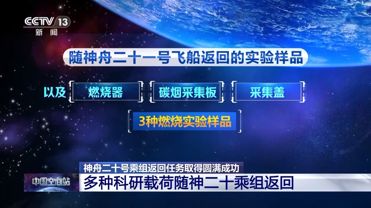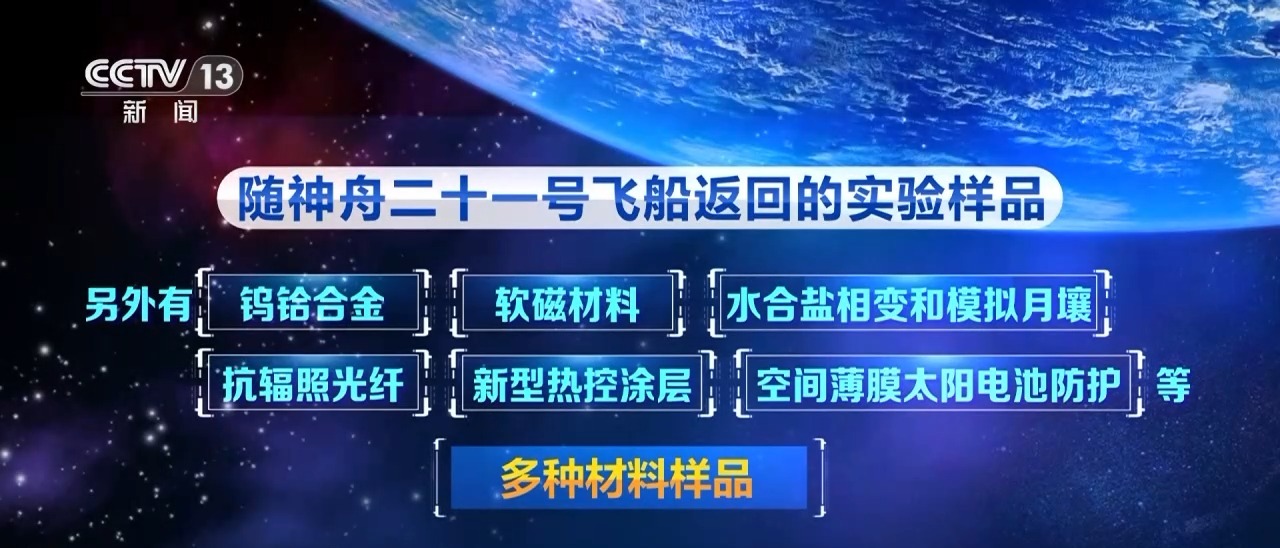 随神舟二十一号飞船返回的实验样品包括实验小鼠、斑马鱼和金鱼藻、巨噬细胞、肝细胞等9种生命实验样品;另外有钨铪合金、软磁材料、水合盐相变和模拟月壤、抗辐照光纤、新型热控涂层、空间薄膜太阳电池防护等多种材料样品,以及燃烧器、碳烟采集板及采集盖3种燃烧实验样品。
