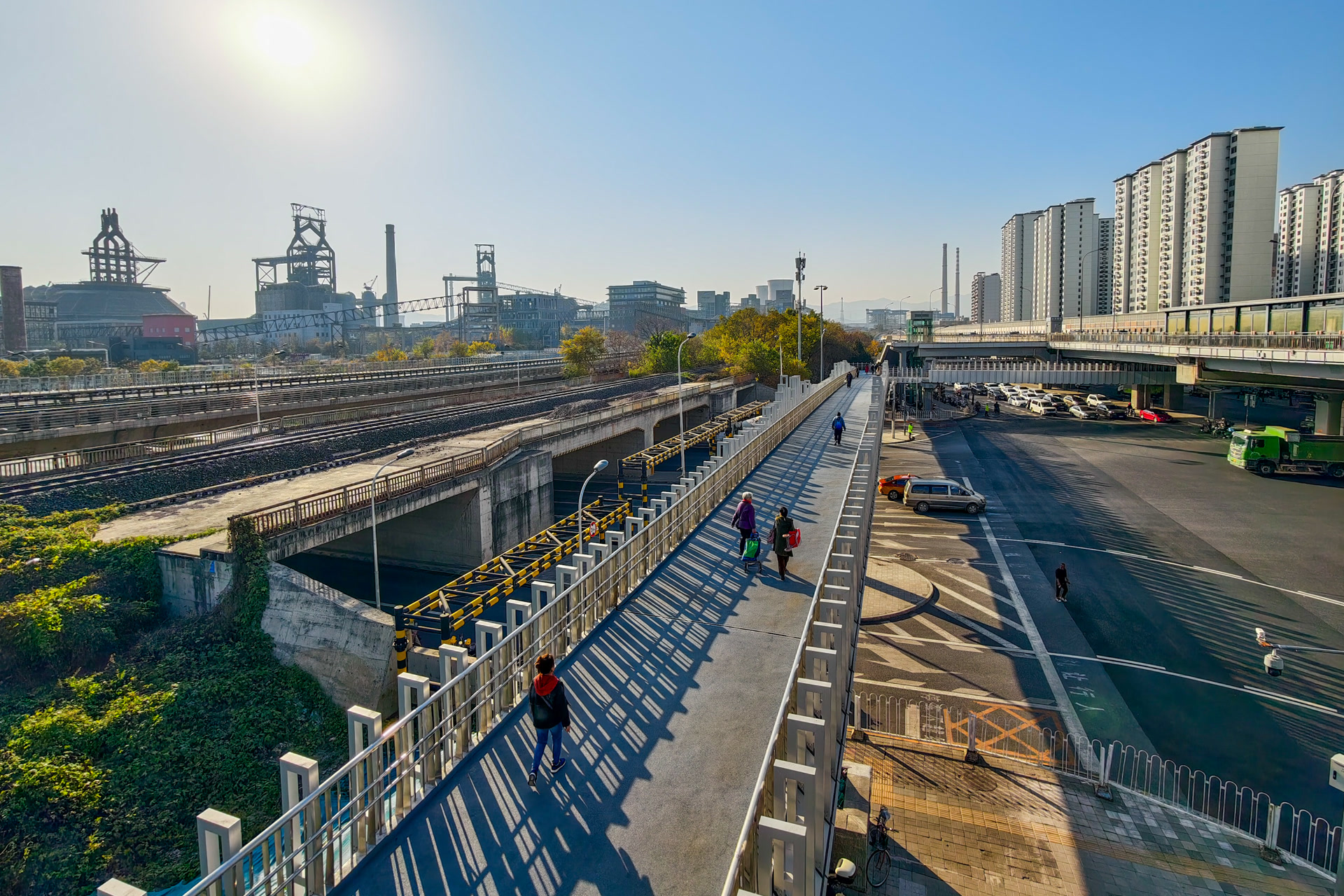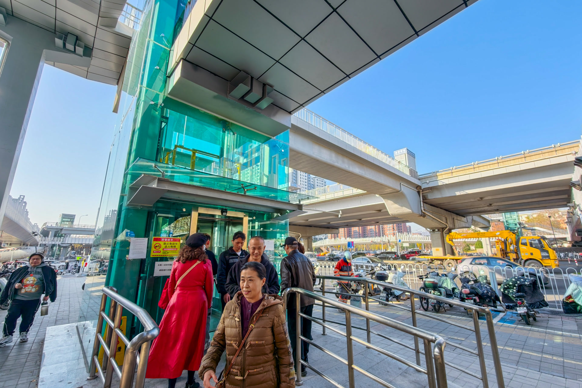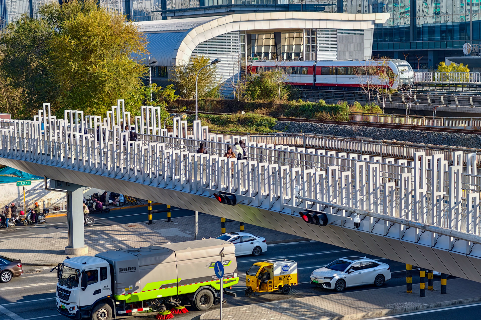 实现立体换乘的同时,项目还融入不少人性化细节:15厘米高台阶搭配1:12缓坡梯道方便老人通行,8部自动扶梯、4部垂直电梯及盲道设施,实现全人群无障碍换乘。天桥投用后,行人对角线穿越时间从6分钟压缩至不足2分钟,换乘效率提升40%;人车彻底分流,机动车通行速度提高3倍以上,路口交通事故率降为零。