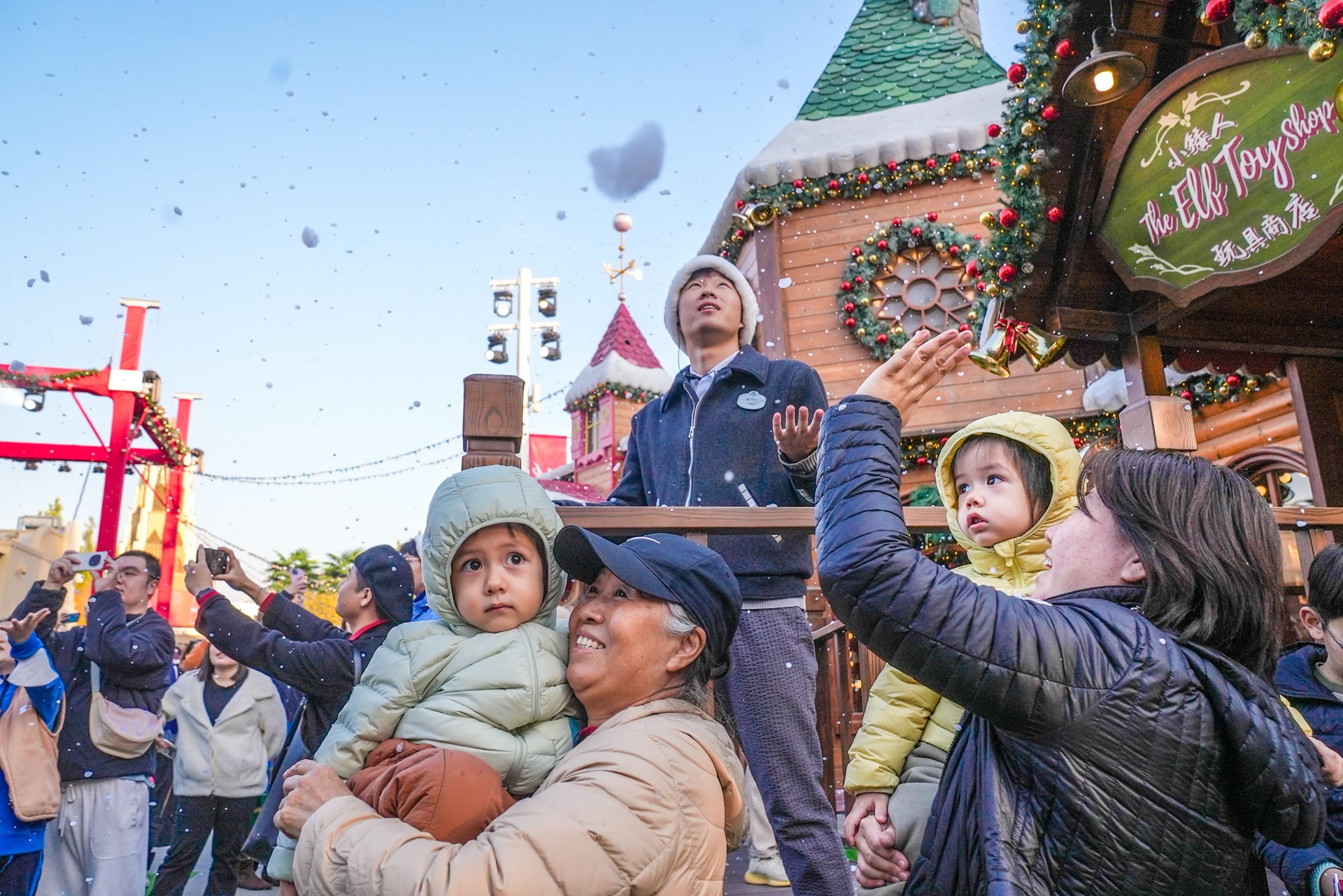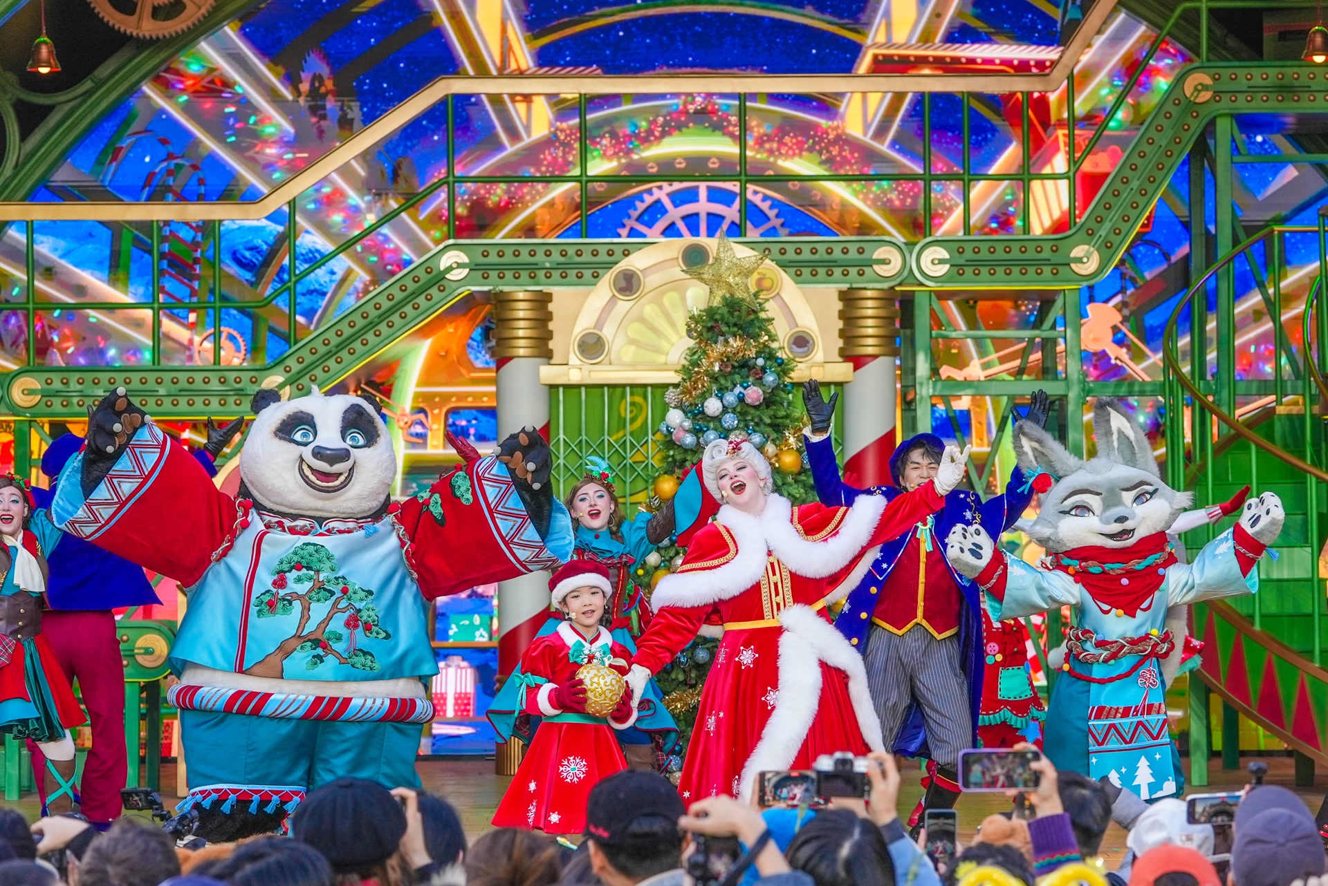 四面八方的游客特意奔赴好莱坞剧场,一场冬日限定演出“最棒的礼物”在这里上演。舞台被打造成一座精灵玩具工厂,金色的机械装置与雪顶木屋、礼物、花条与彩灯装饰呼应。众多备受喜爱的IP明星角色与数十位歌手和舞者换上充满节日气息的全新冬季主题服饰。随着剧情的推进,一场“降雪”翩然而至,观众席传来阵阵欢呼尖叫声,人们纷纷举起手机记录这一精彩瞬间。