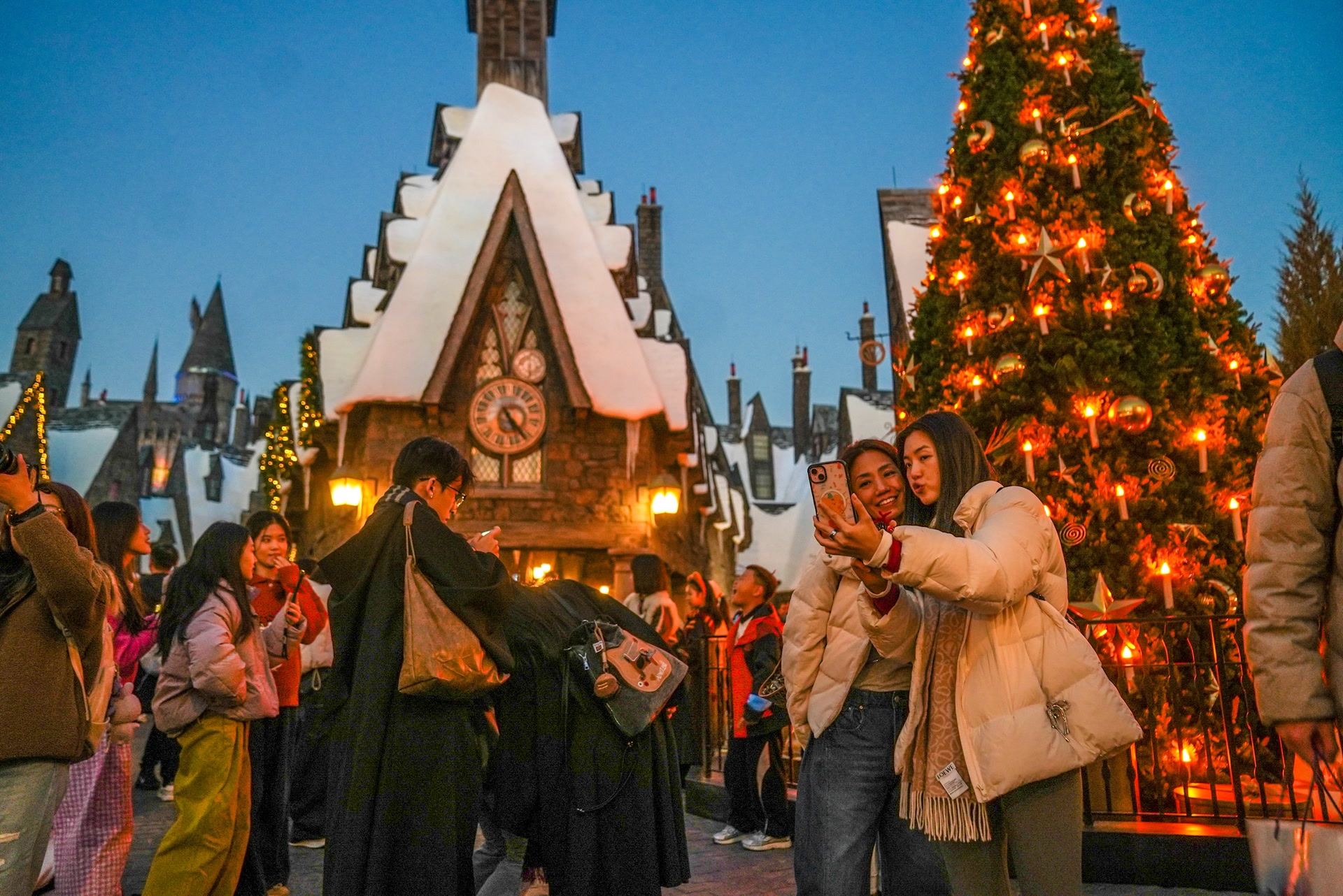夜色渐浓,人气儿最旺的区域当属哈利·波特的魔法世界,霍格莫德村内人流如织,节日花环、浆果与缎带等巫师们钟爱的传统节庆装饰装点着整条街道,街巷的橱窗被灯光点亮,松树林被光点围绕,首个霍格沃茨城堡魔法庆典光影在夜幕中绽放。