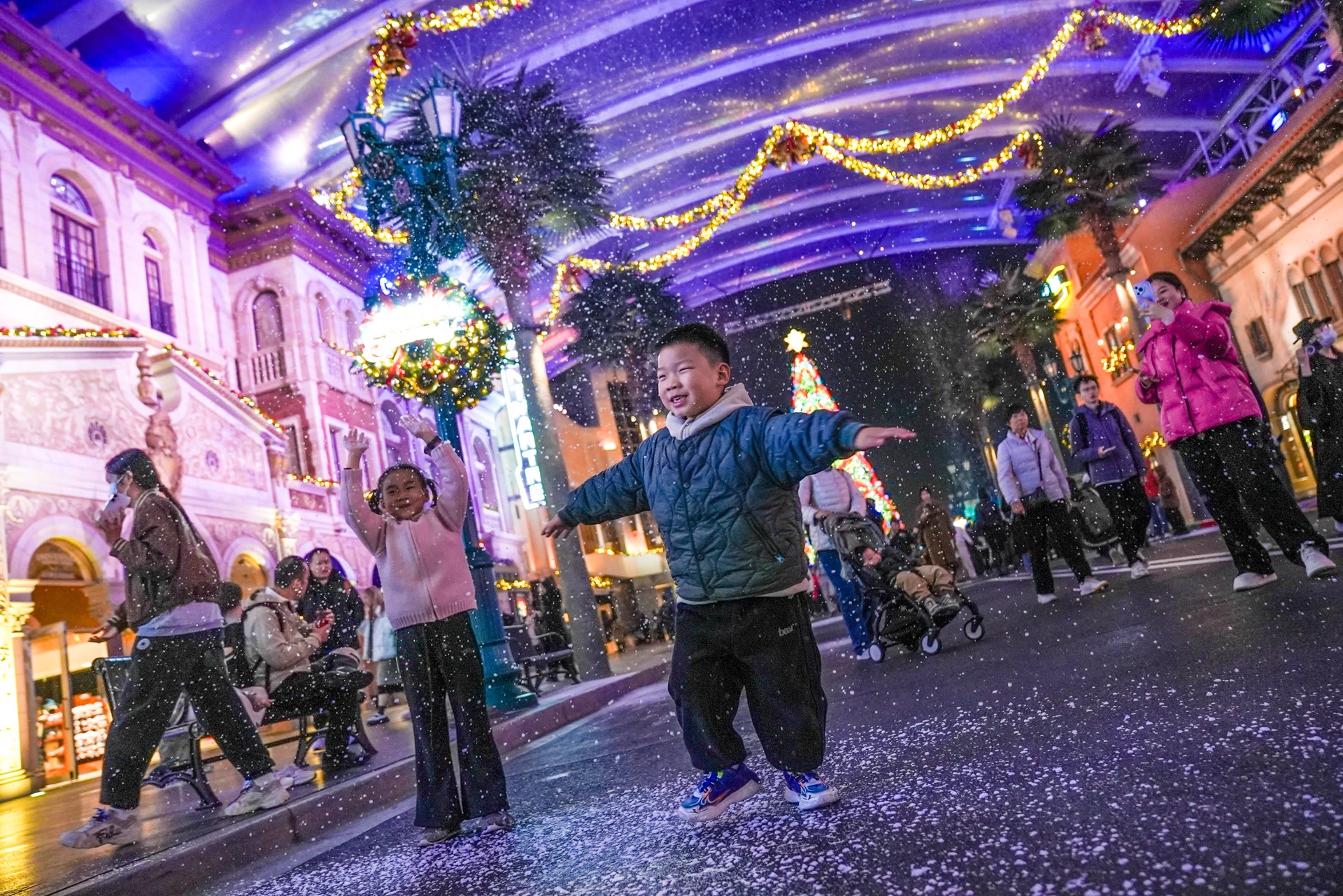 此时的好莱坞大道也是一片热闹景象,天棚的惊喜“落雪”为大片世界冬意再添浪漫氛围。大道尽头,冬日音乐旋律悠扬,炫彩灯光爬上星耀树枝头,洋溢着浓郁的节日氛围。