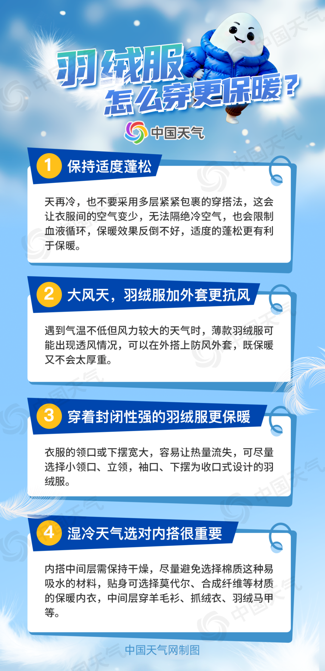 未来几天,寒冷天气将侵袭我国中东部大部分地区,而羽绒服是重要的保暖神器。四个小技巧来看羽绒服如何穿更保暖——