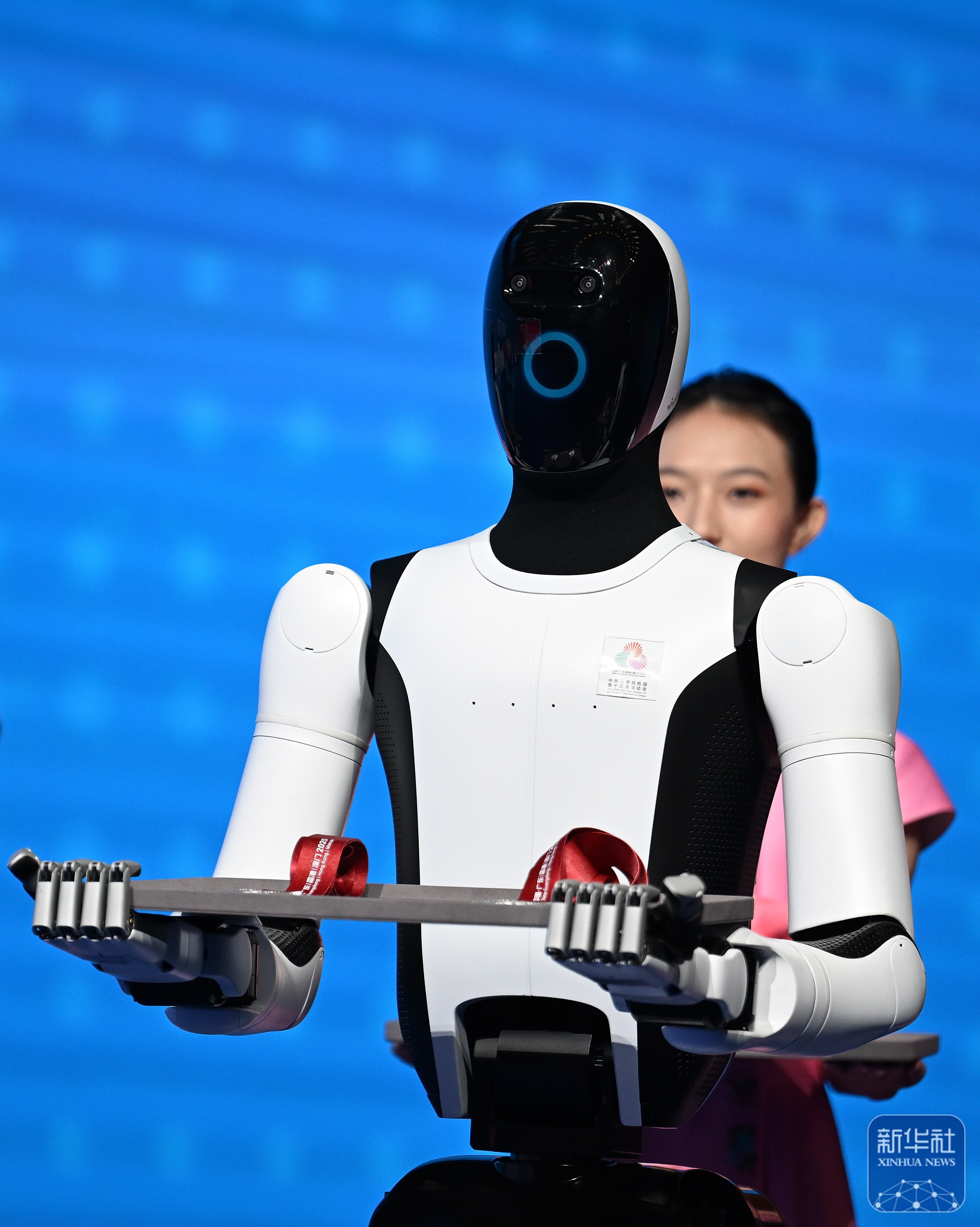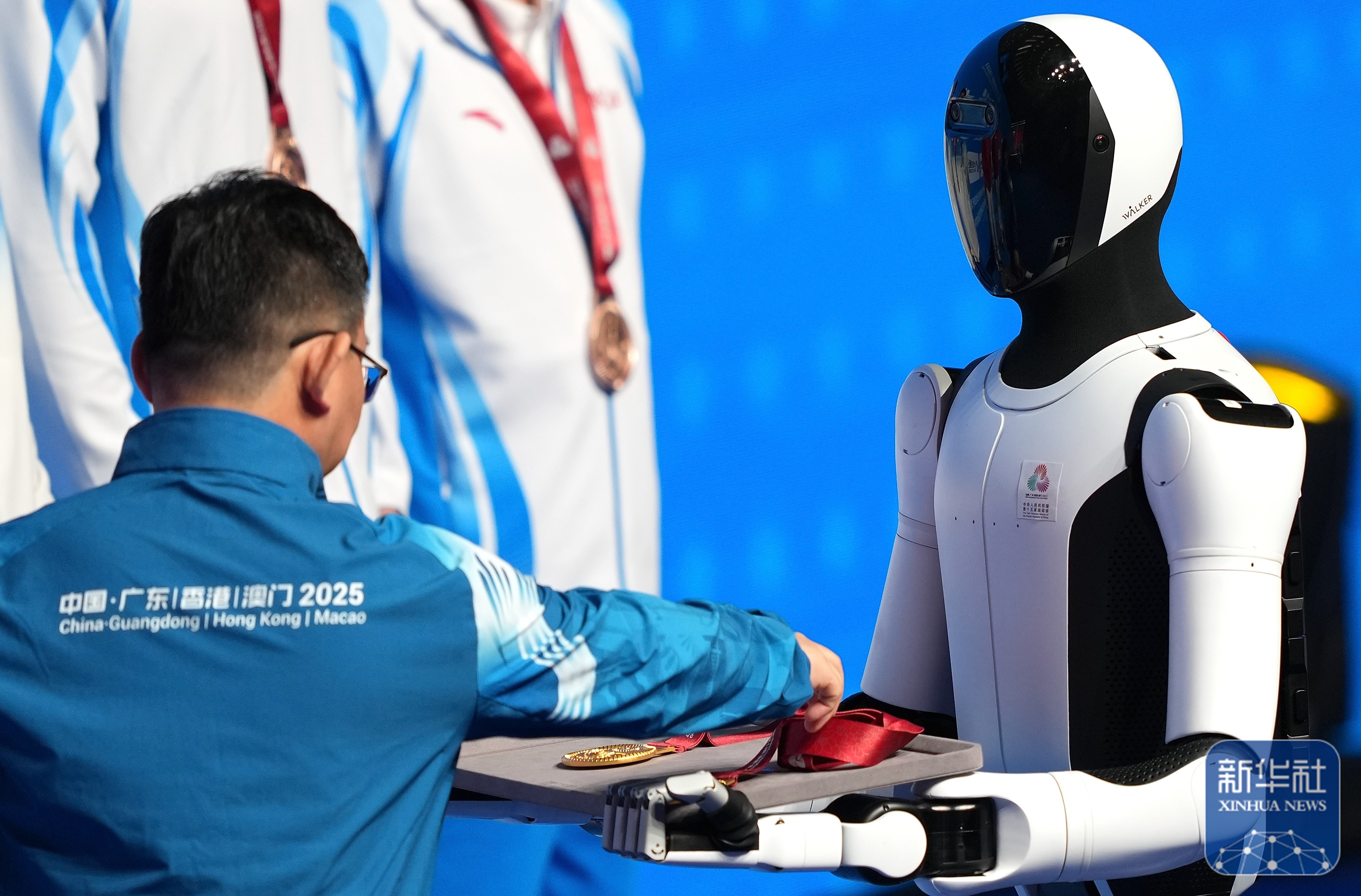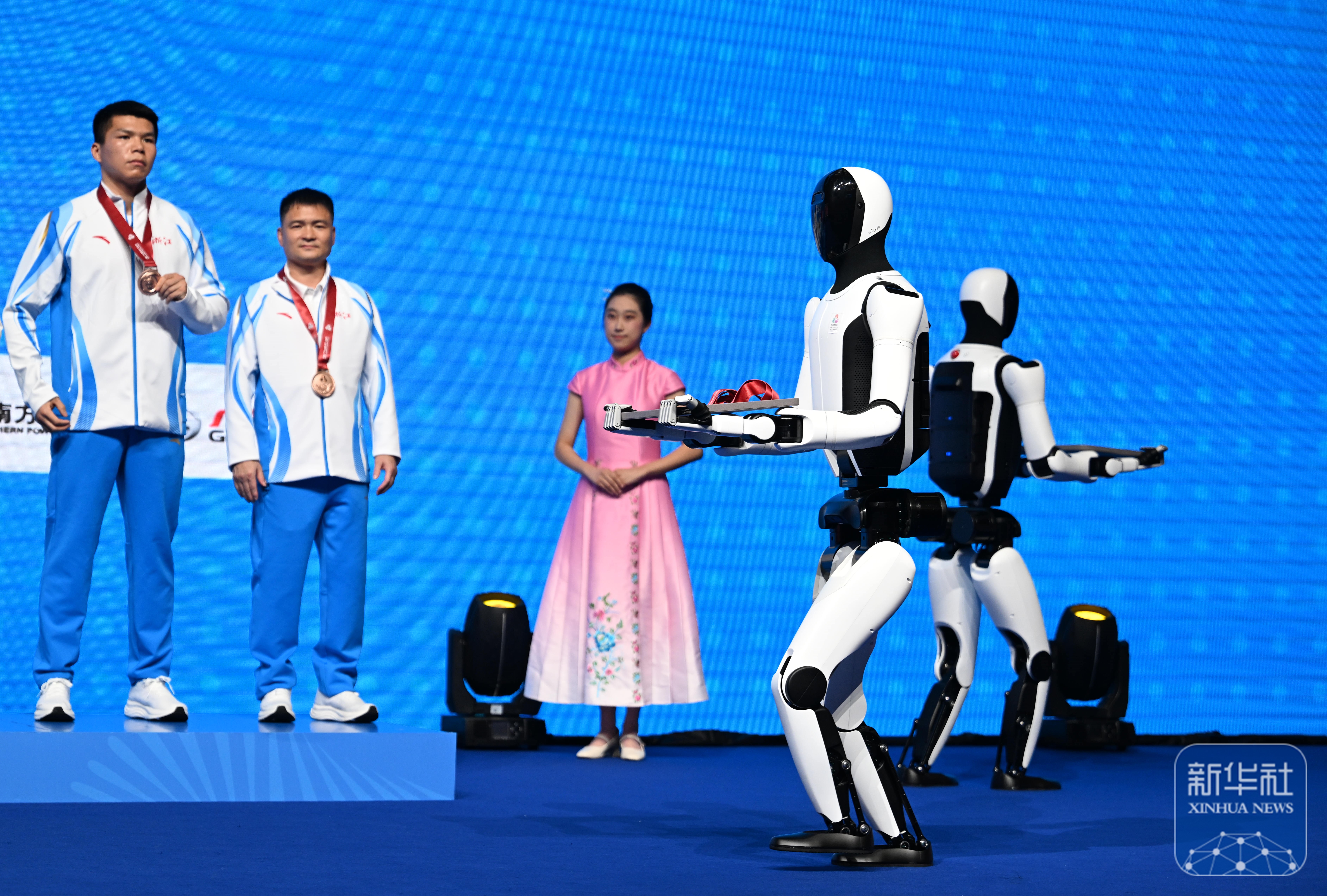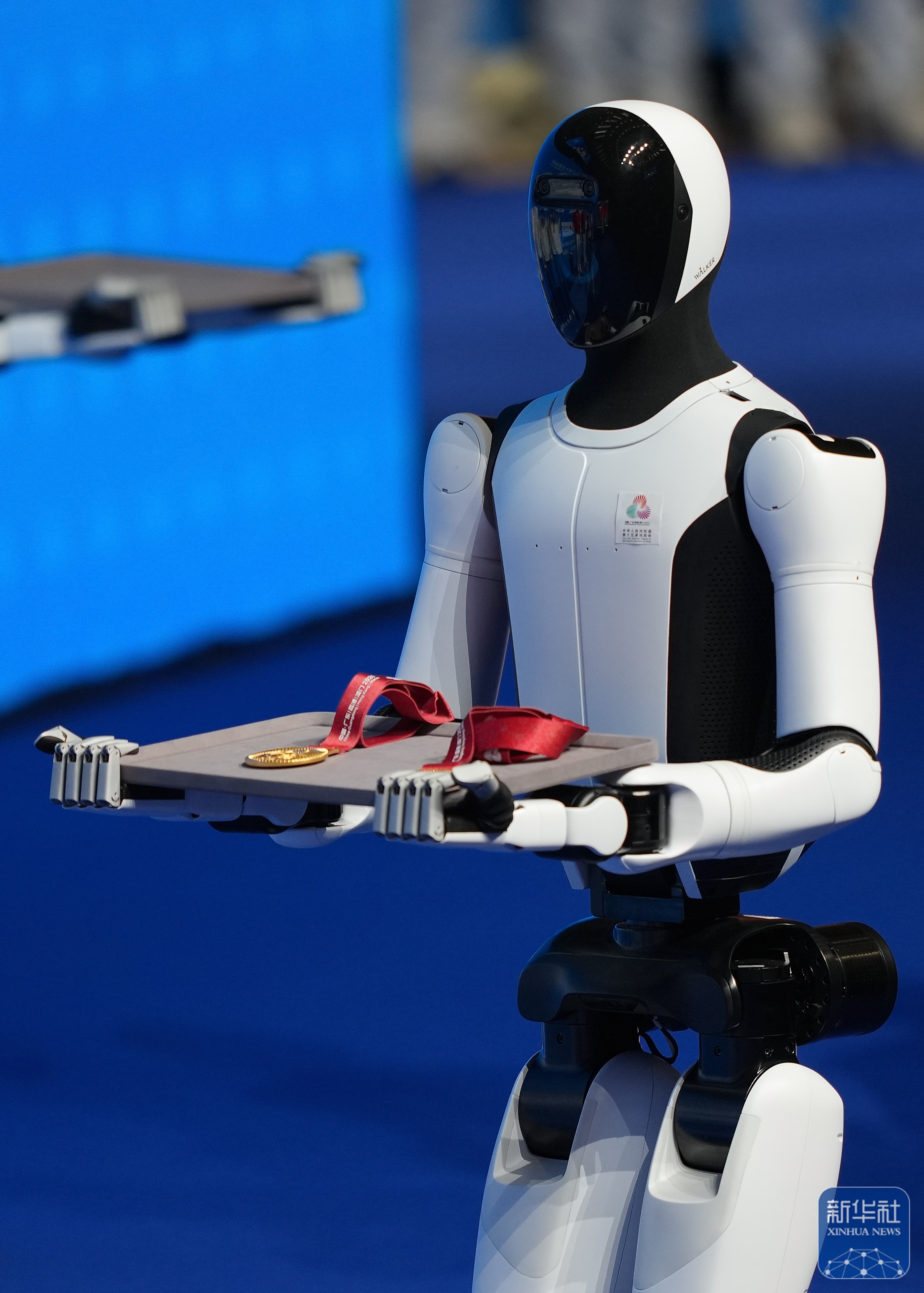 人形机器人在颁奖仪式上为颁奖嘉宾递上奖牌。 新华社记者 彭奕凯 摄