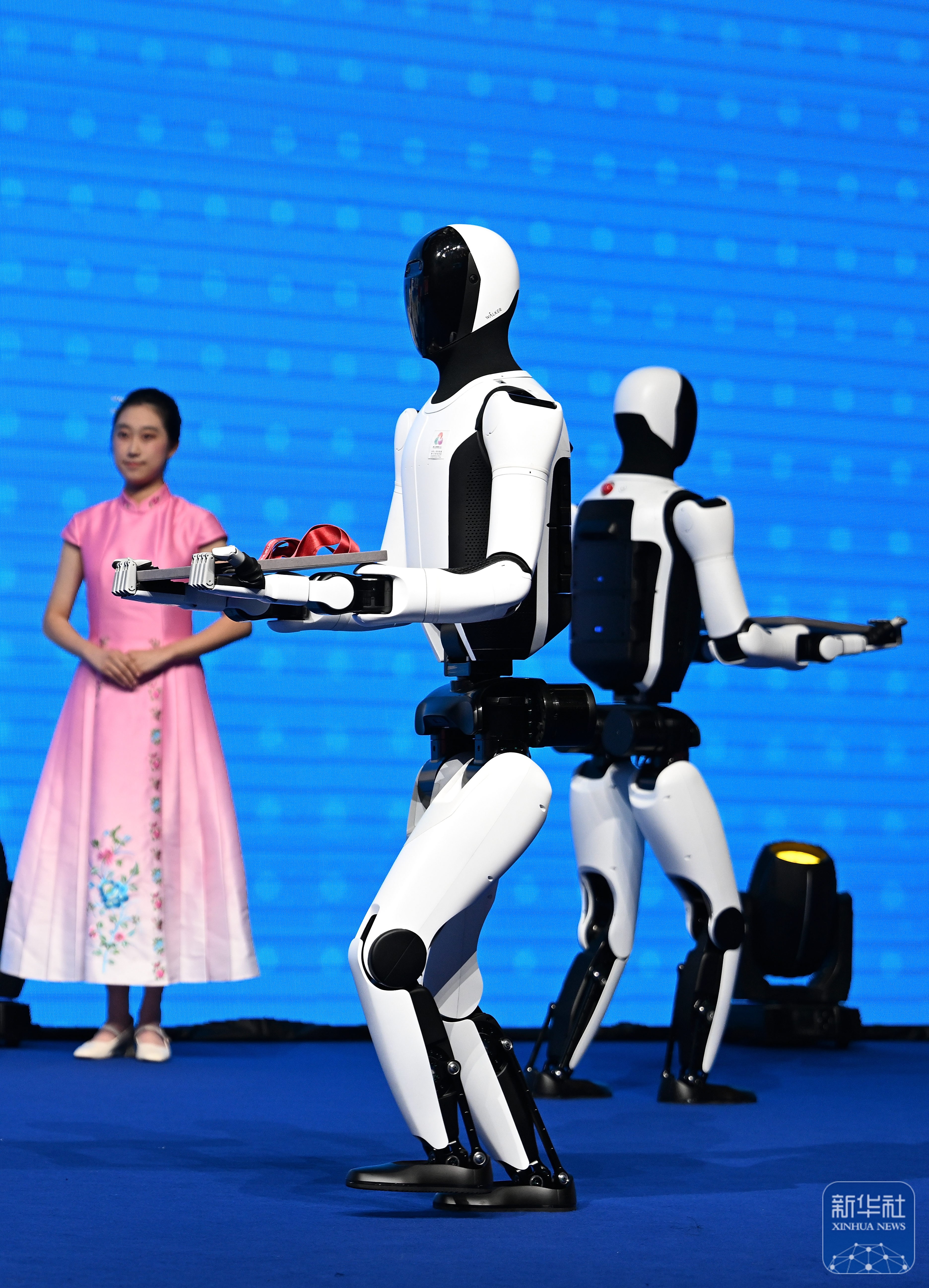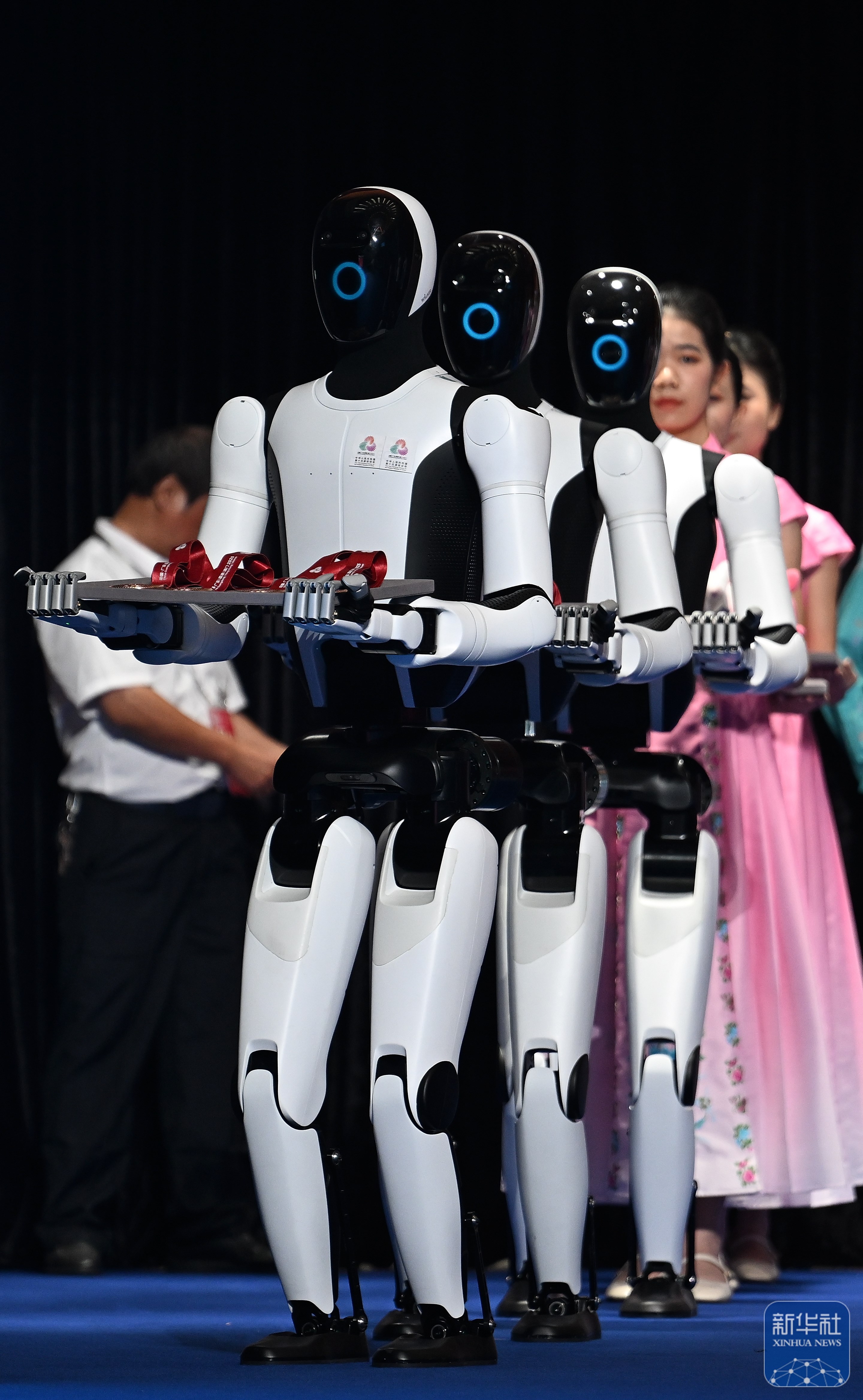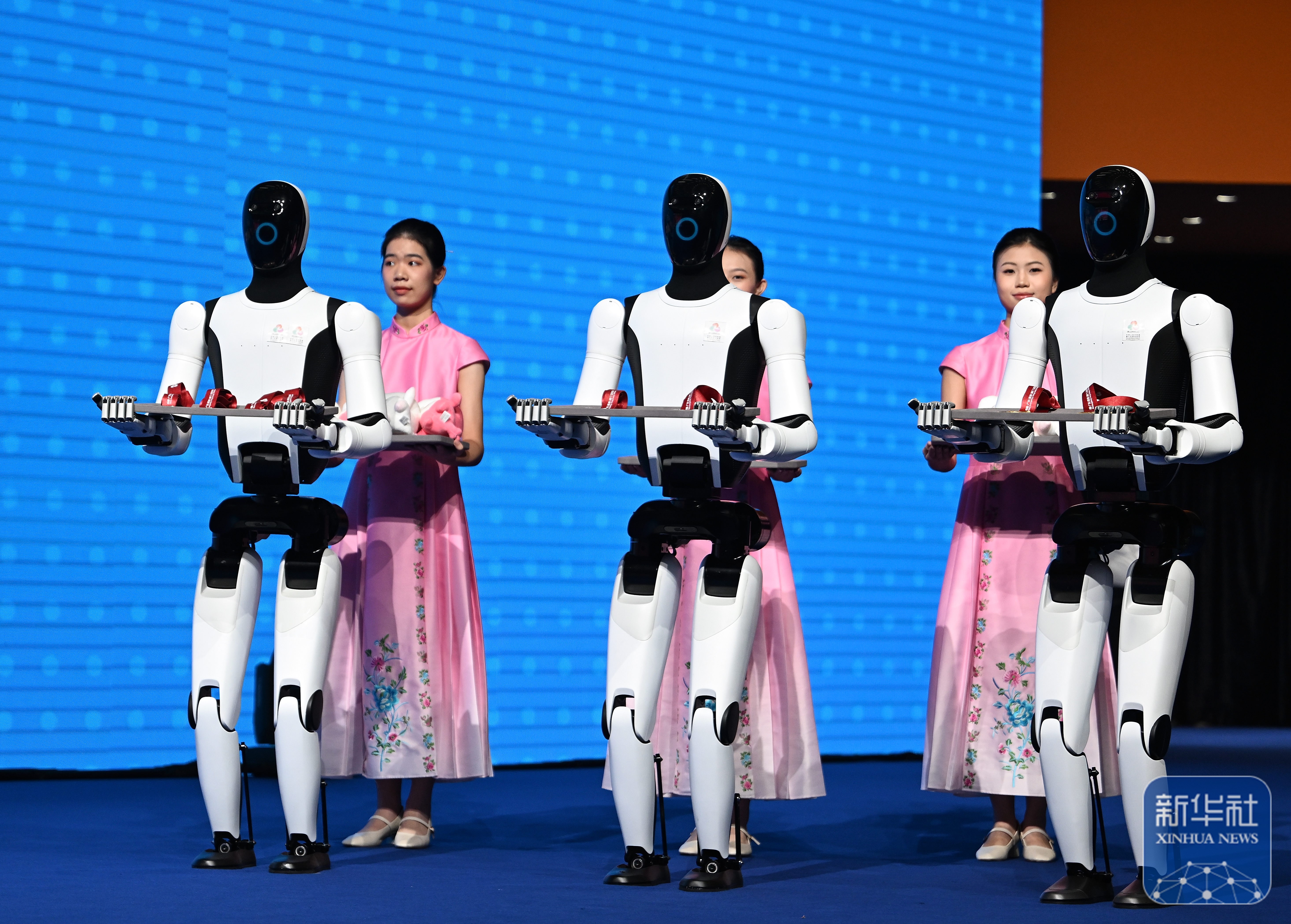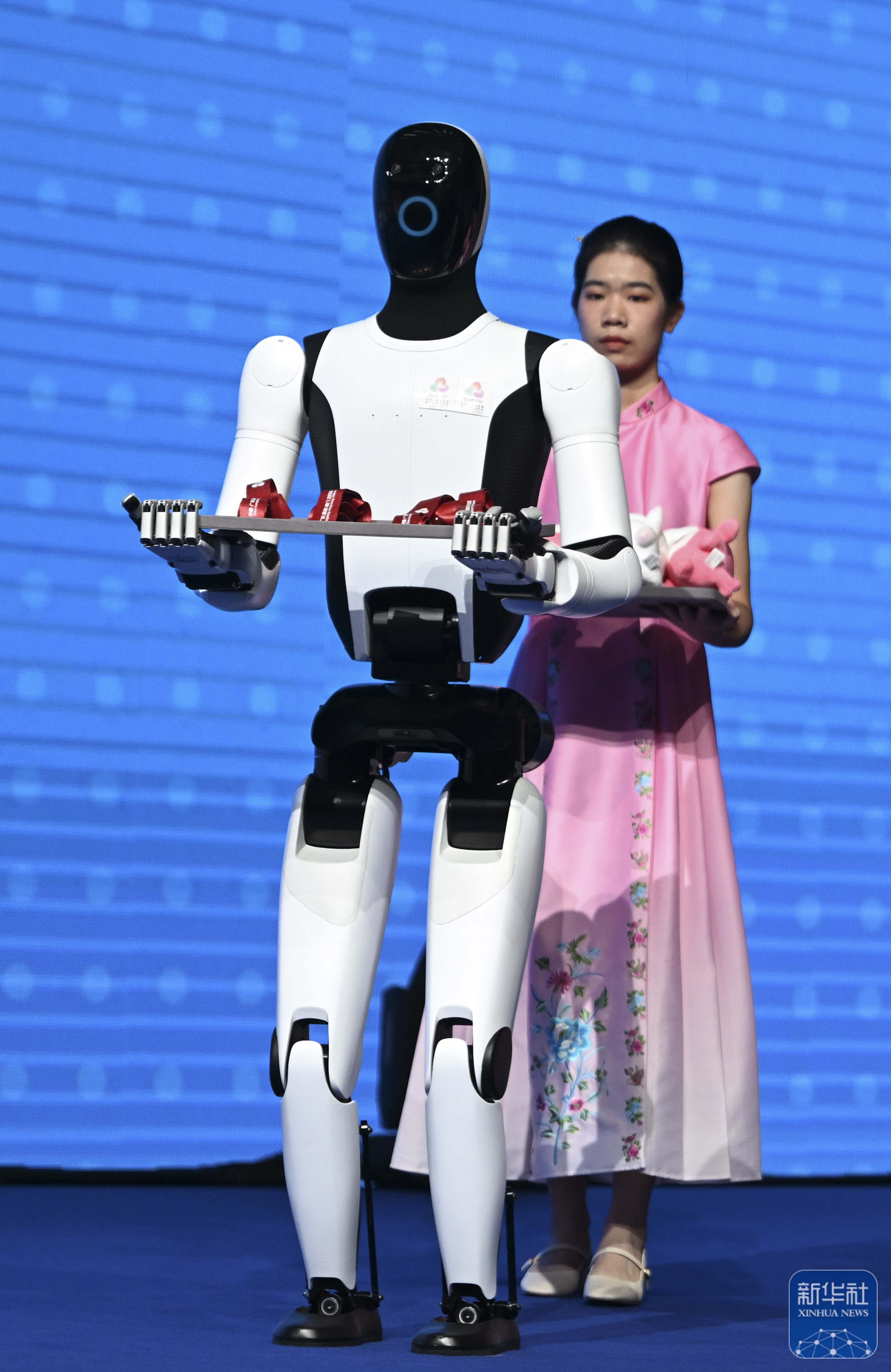 人形机器人在颁奖仪式上为颁奖嘉宾递上奖牌。 新华社记者 彭奕凯 摄
