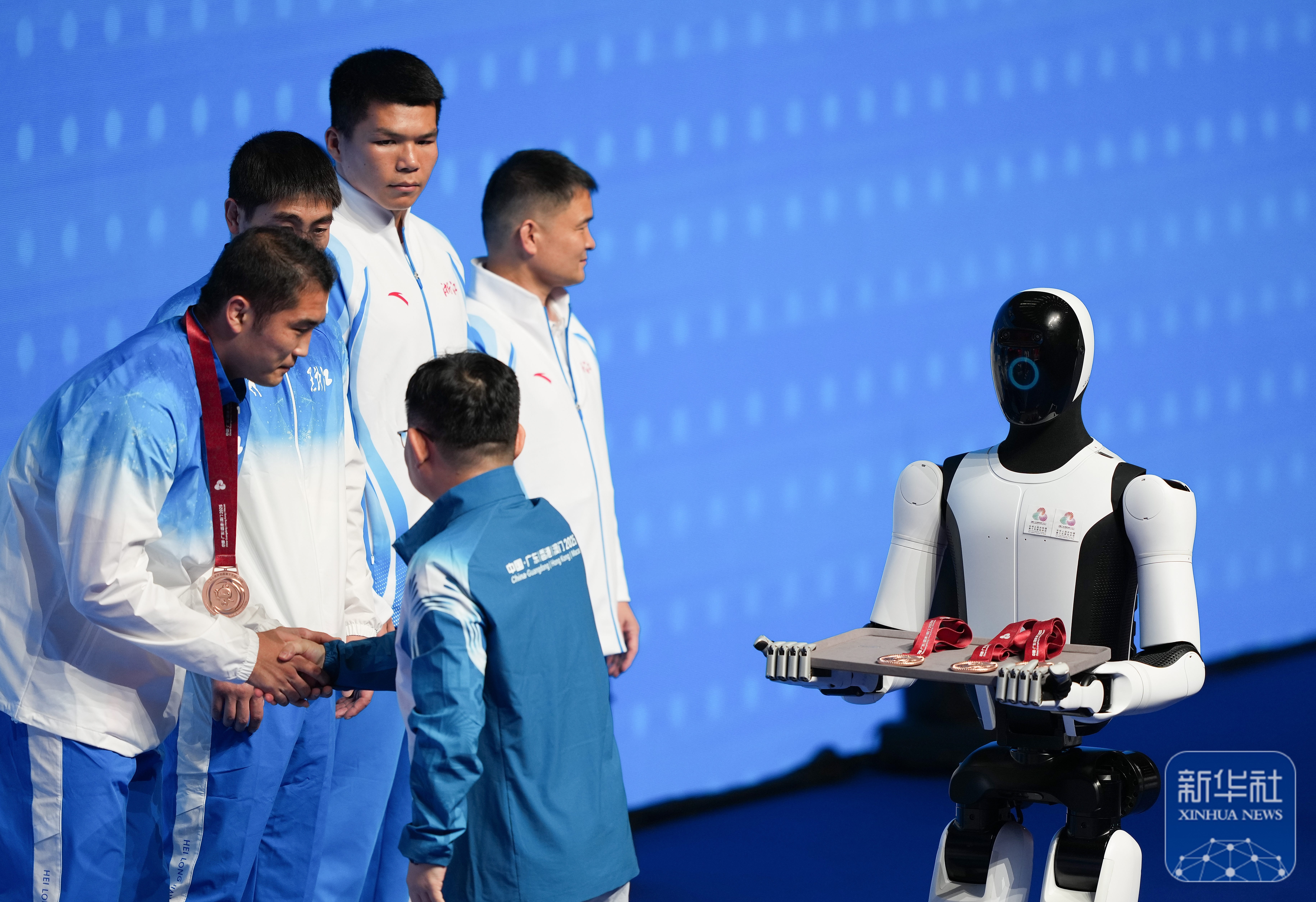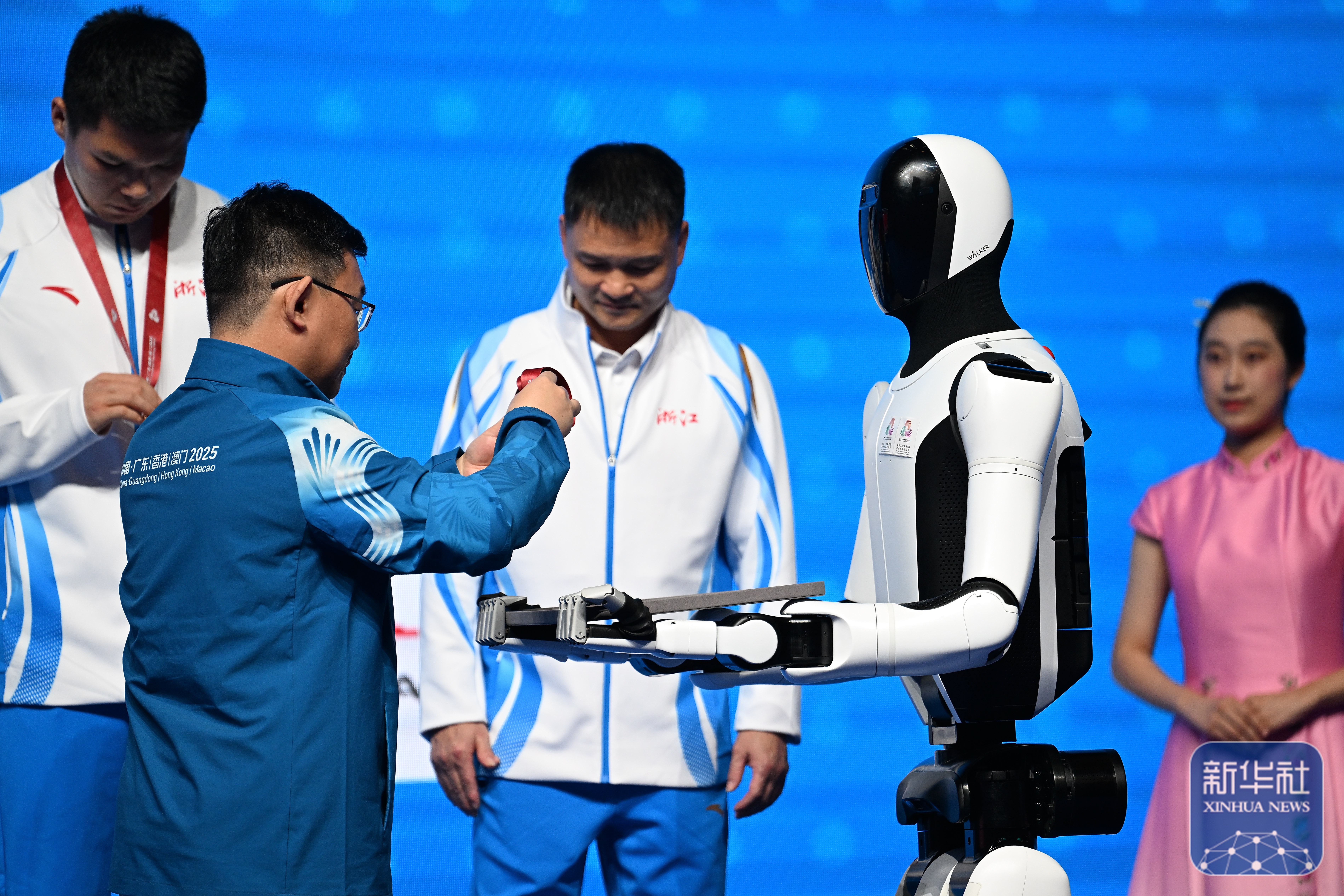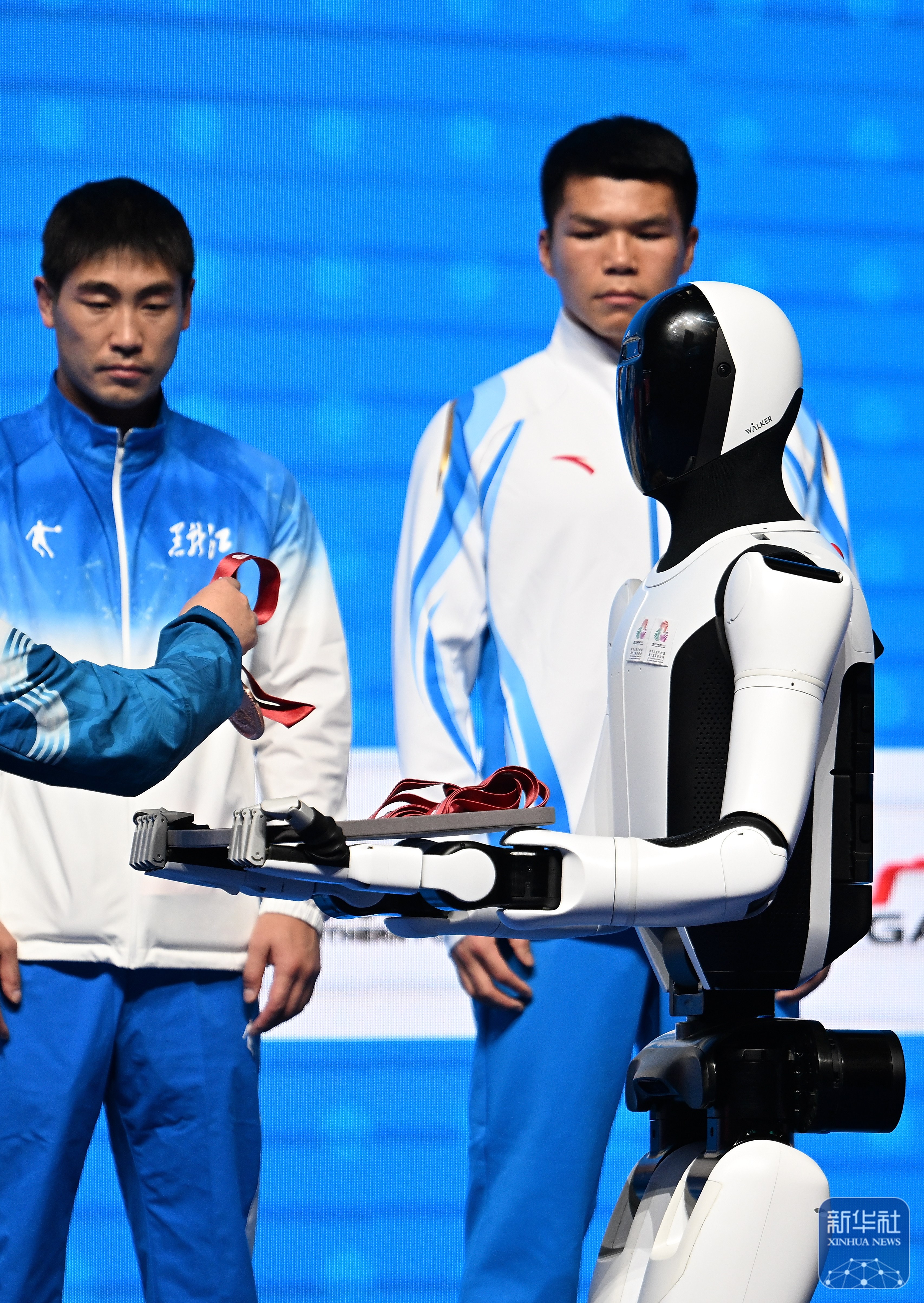 人形机器人在颁奖仪式上为颁奖嘉宾递上奖牌。 新华社记者 杨冠宇 摄